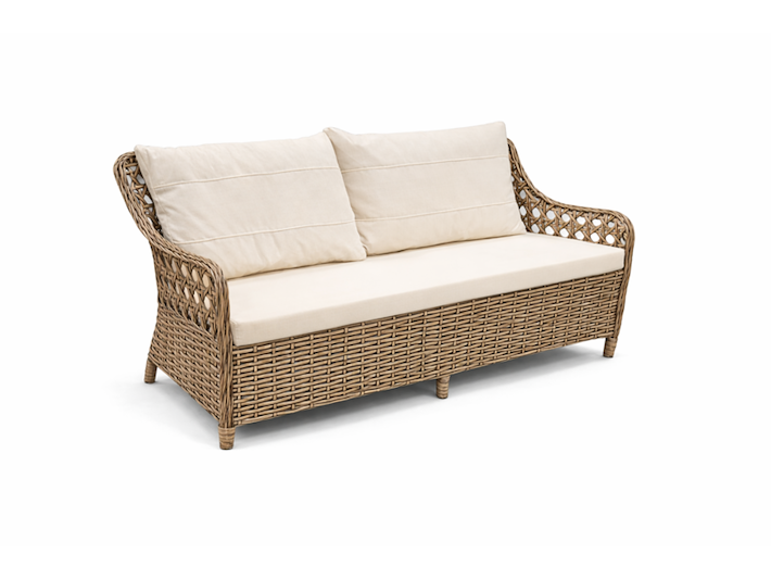 Product: Tuinset Kleur: bruin,cappucinno Materiaal: aluminium frame, polyrotan, stof Afmeting: tafel: 120x70x70 bank: 140x55x87 stoel: 65x55x87 Conditie: nieuw Specificaties: bank 2 stoelen tafel met glasplaat