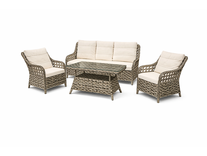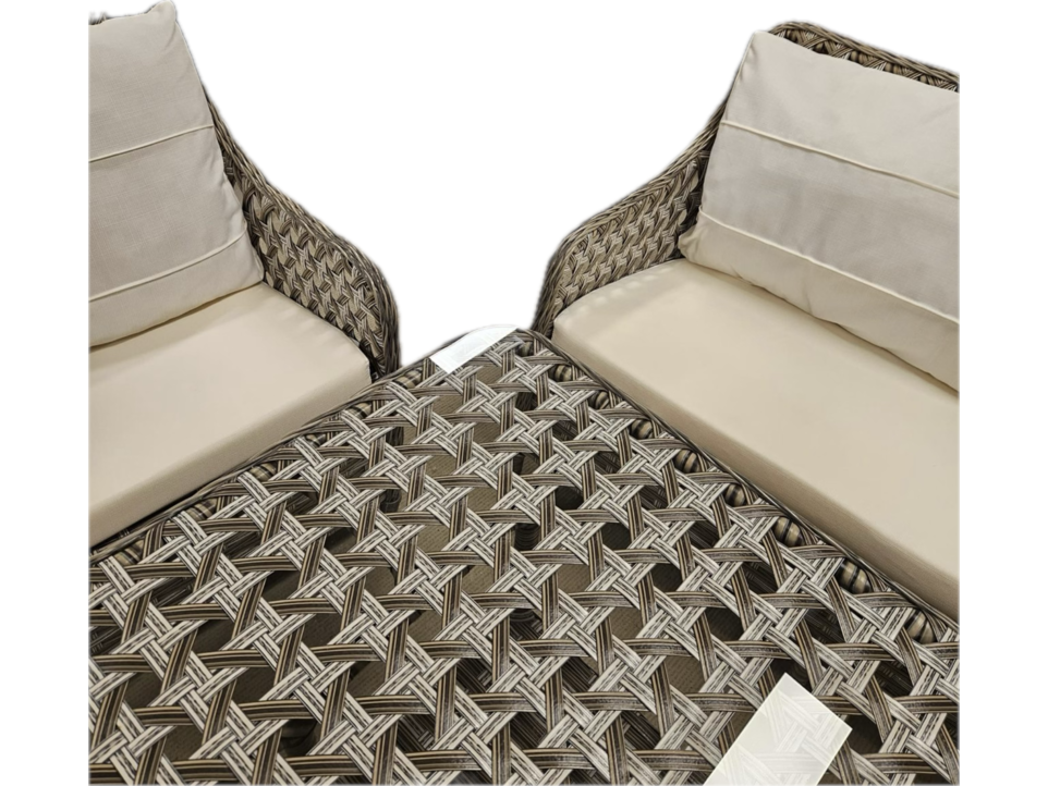 Product: Tuinset Kleur: bruin, licht grijs Materiaal: aluminium frame, polyrotan, stof Afmeting: tafel: 120x70x70 bank: 140x55x87 stoel: 65x55x87 Conditie: nieuw Specificaties: bank 2 stoelen tafel met glasplaat