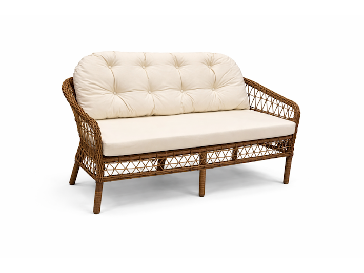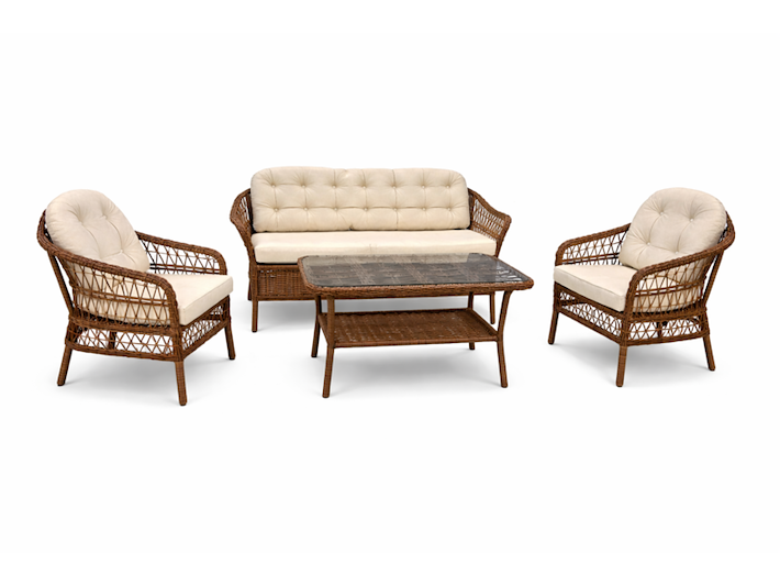 Product: Tuinset Kleur: bruin Materiaal: aluminium frame, polyrotan, stof Afmeting: tafel: 112x70x52 bank: 137x70x75 stoel: 70x62x75 Conditie: nieuw Specificaties: bank 2 stoelen tafel met glasplaat