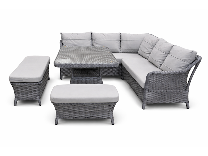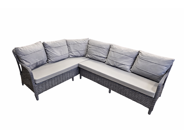 Product: Tuinset Kleur: grijs, antraciet Materiaal: aluminium frame, polyrotan, stof Afmeting: tafel: 142x82x70 bank: 175x247x80 poef 1: 78x45x48, poef 2: 138x45x48 Conditie: nieuw Specificaties: hoekbank 1 poef klein 1 poef groot tafel met glasplaat