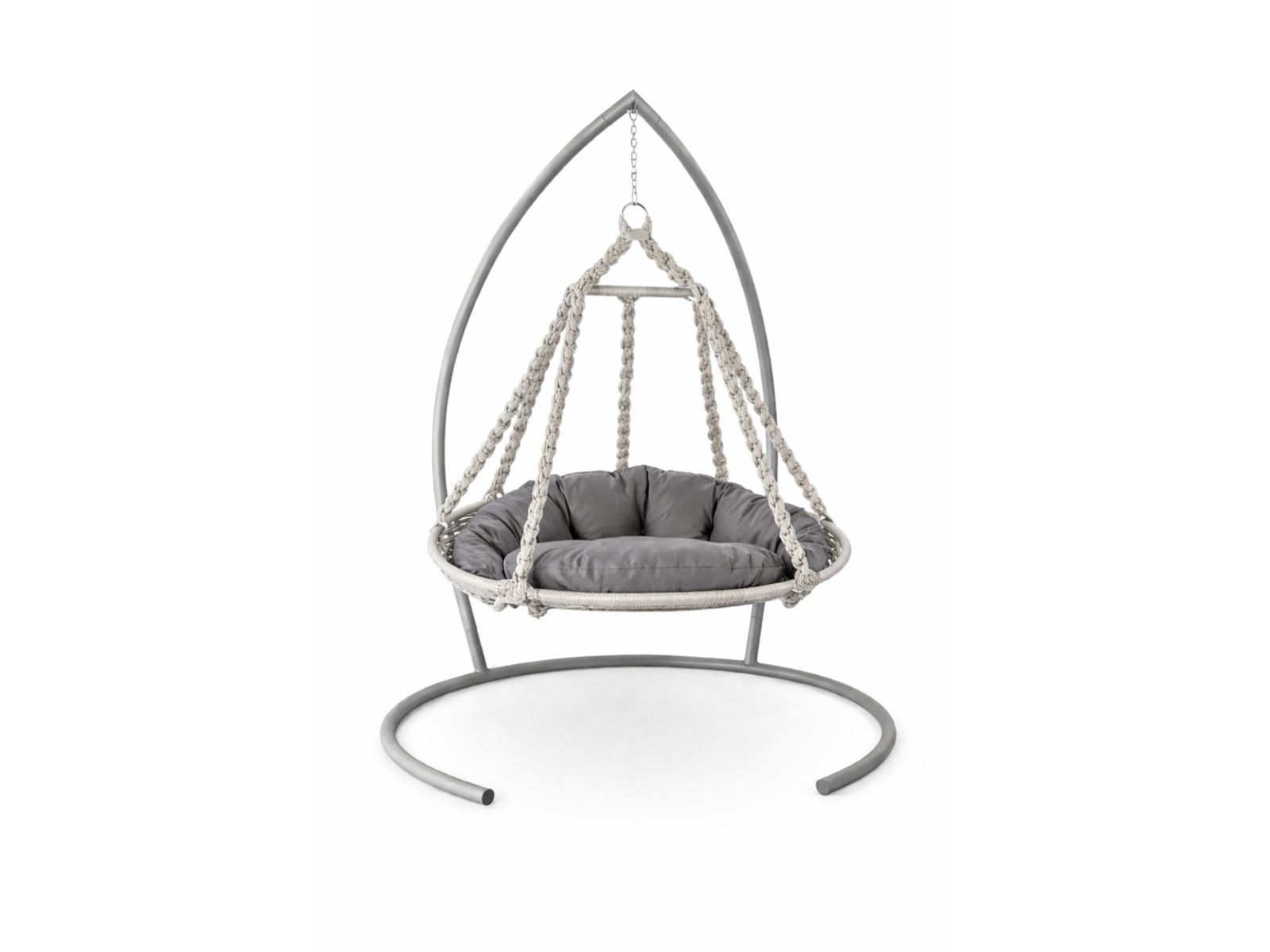 Product: Hangstoel Kleur: licht grijs/antraciet Materiaal: ijzer frame, stof, nylon Afmeting: frame: 185x167x240 Conditie: nieuw Specificaties: draagvermogen: 250kg 2 Personen geschikt voor binnen/buiten
