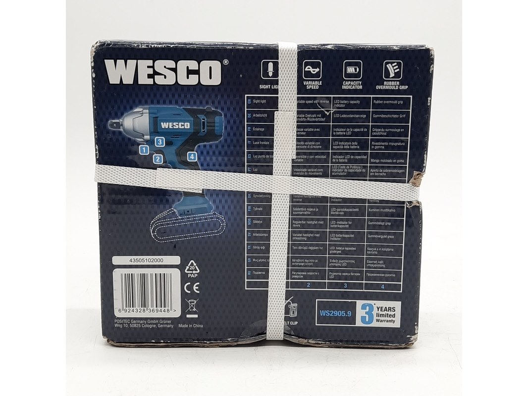 Merk: Wesco Product: Accu slagmoersleutel Conditie: gebruikt Specificaties: Exclusief acculader en accu Doosje is geseald