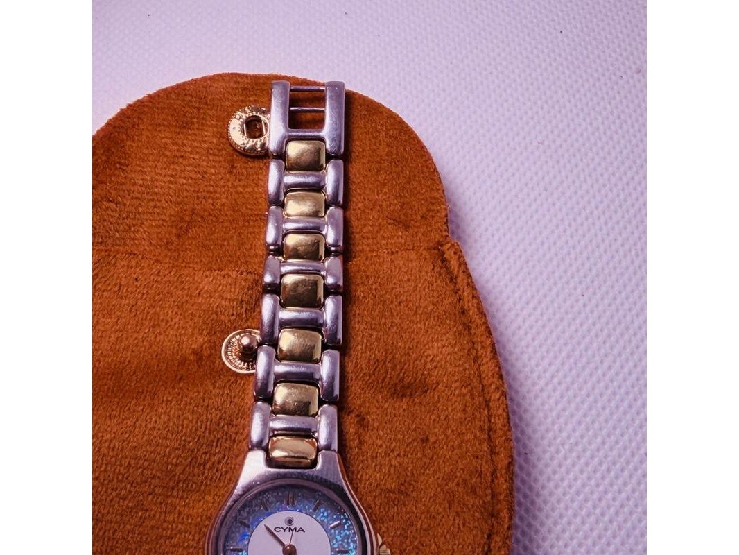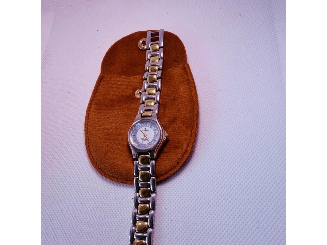 Product: Zwitserse Cyma Sealord juweliershorloge met holografische glitter wijzerplaat Afmeting: 23mm Conditie: Gebruikt Specificaties: Werkend getest op een quartz-tester, heeft een nieuwe batterij nodig. Merk: Cyma. Model: Sealord. Heeft gebruikssporen. Inclusief lederen Claudio Ferrici etui.
