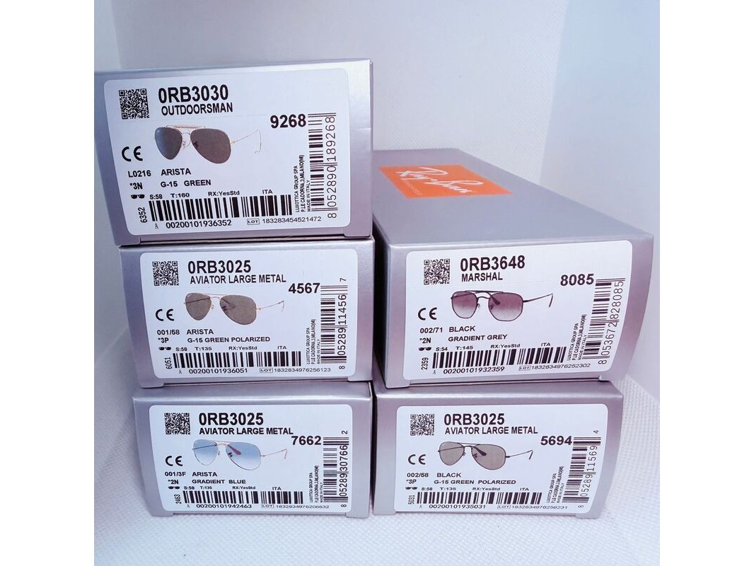 Product: 5 x Rayban Polarized zonnebrillen - Aviator, Outdoorsman, Marshal Conditie: Nieuw Specificaties: 5 zonnebrillen van Rayban. Nieuw in doos. Modellen: 1 x Aviator Large metal black green polarized. 1 x Aviator Large metal arista green polarized. 1 x Aviator Large metal arista gradient blue. 1 x Outdoorsman arista green. 1 x Marshal black gradient grey.