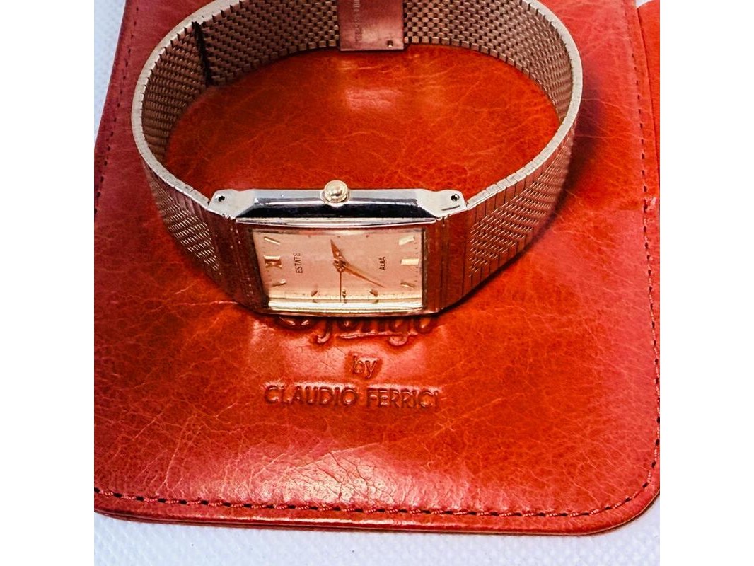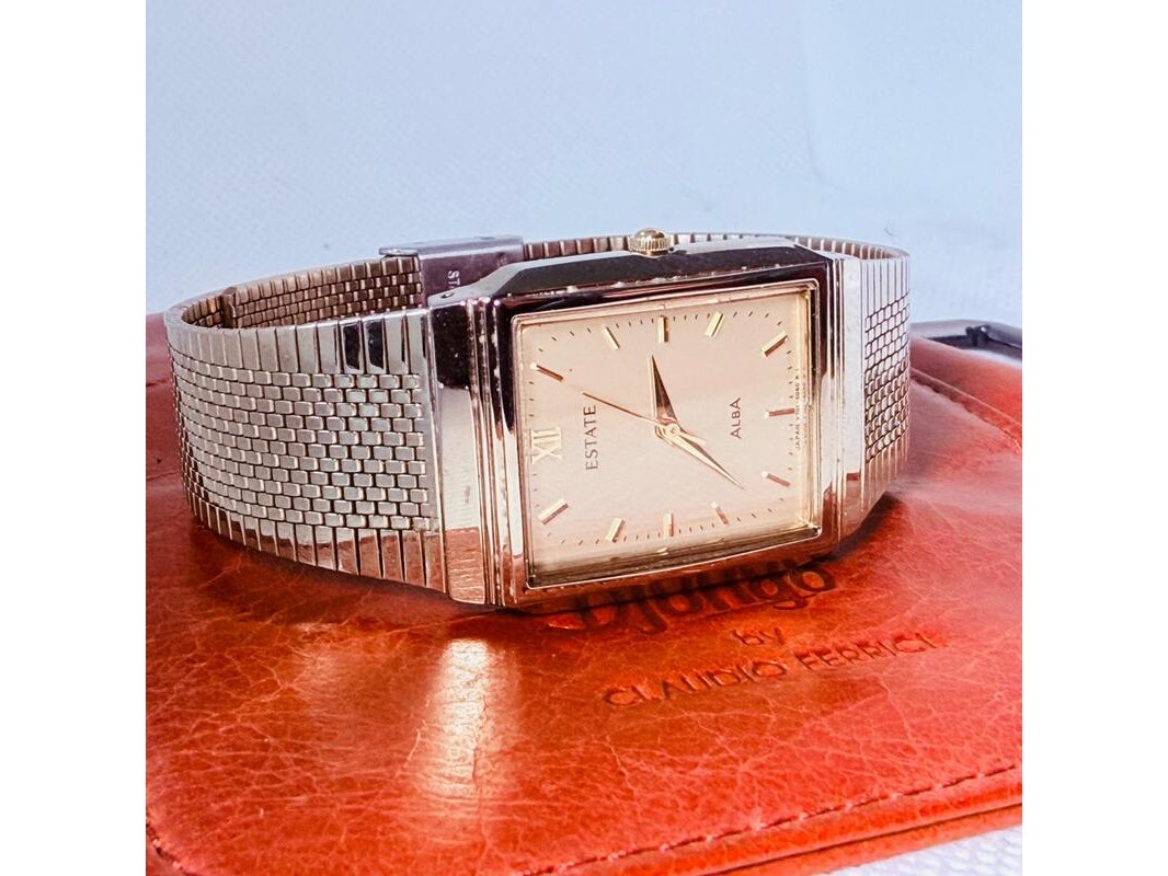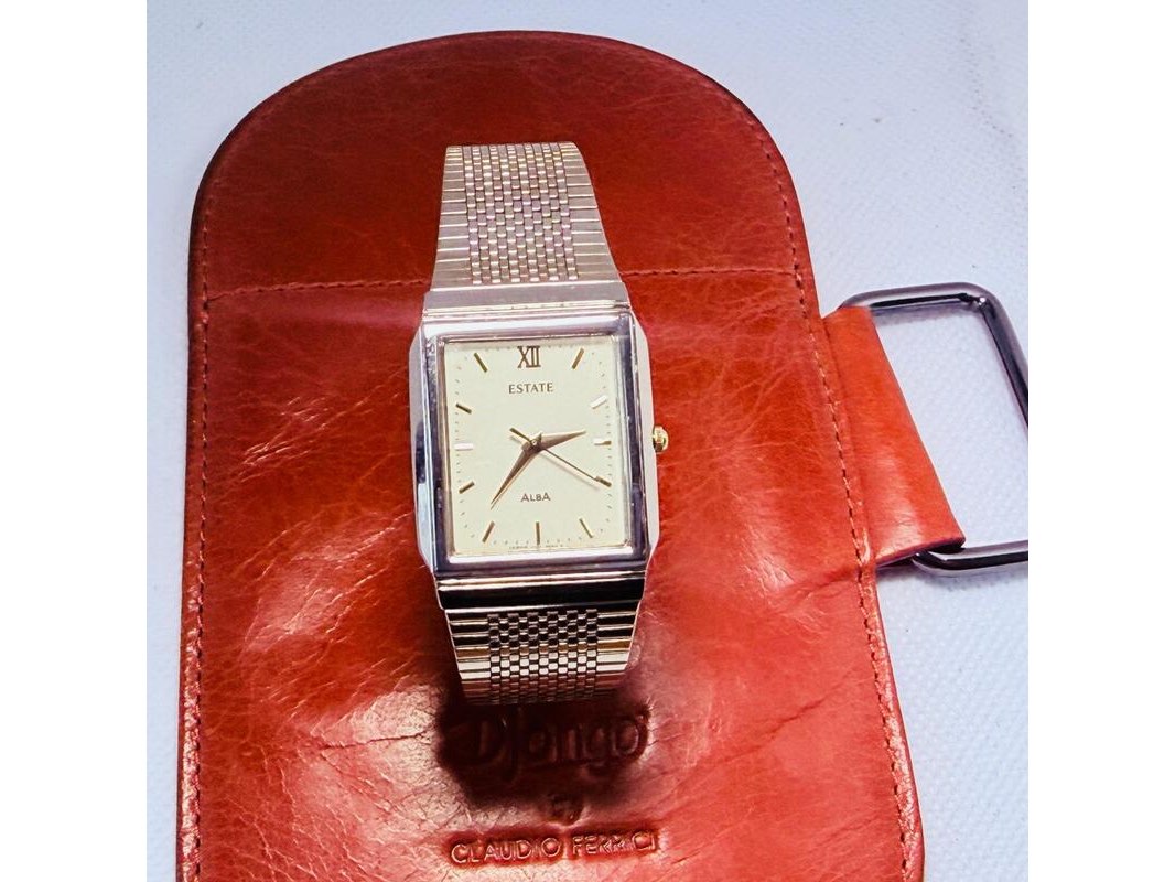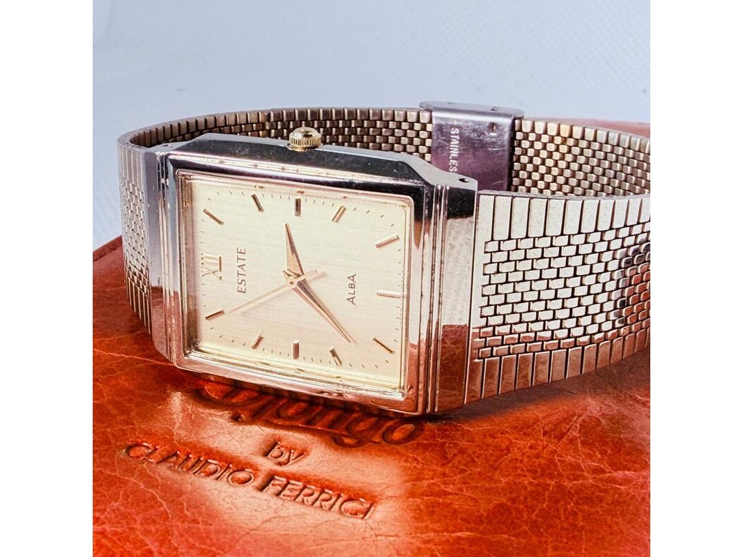 Product: Seiko Alba klassiek tank herenhorloge - Goudkleurige dresswatch Afmeting: 28mm Specificaties: Quartz uurwerk loopt goed. Merk: Seiko. Model: Alba tank. Goudkleurige dresswatch Inclusief Claudio Ferrici lederen etui.