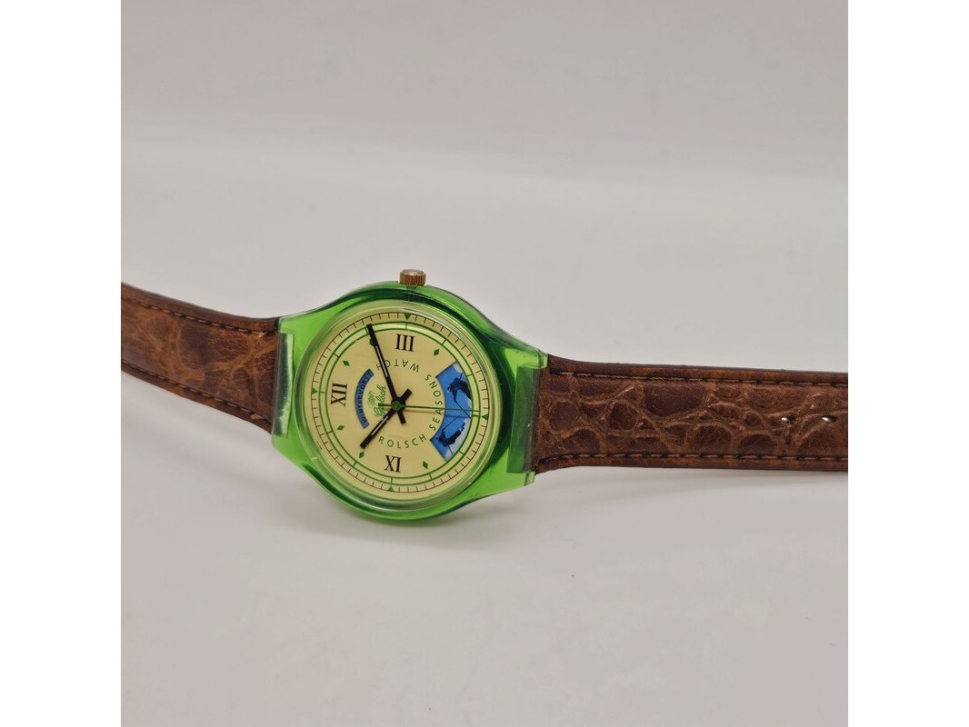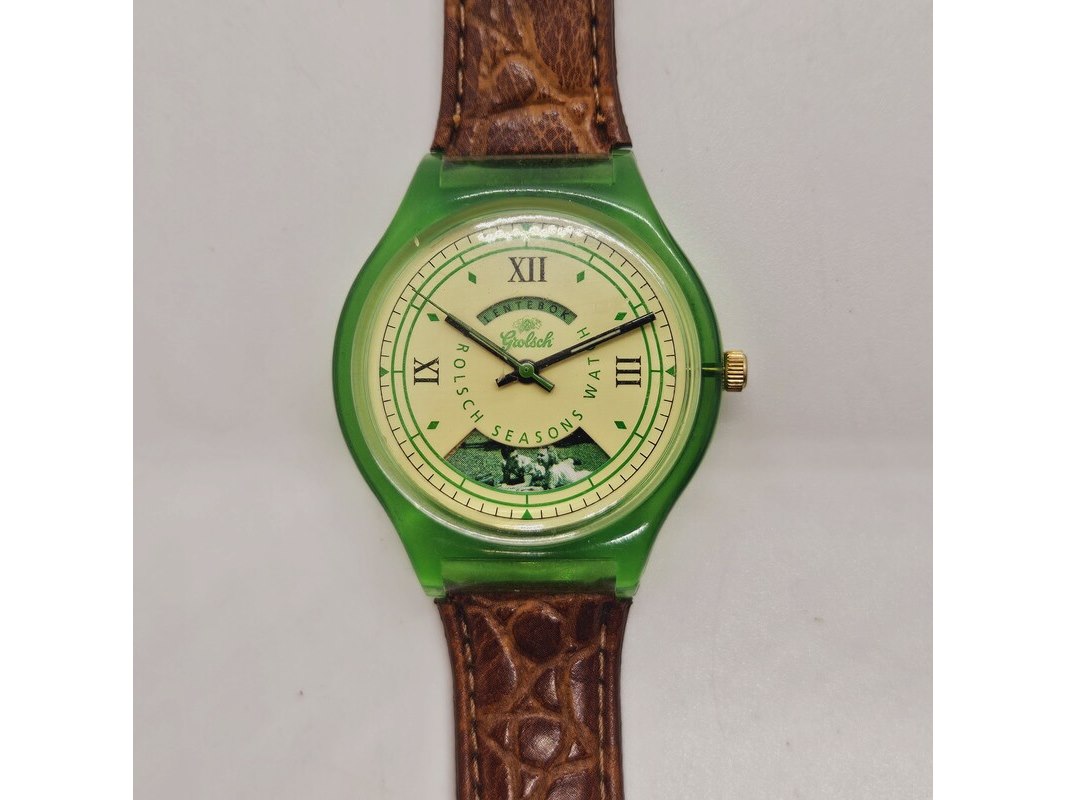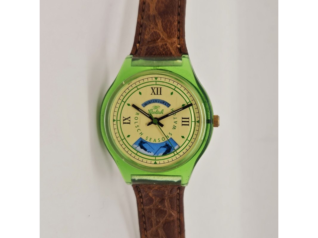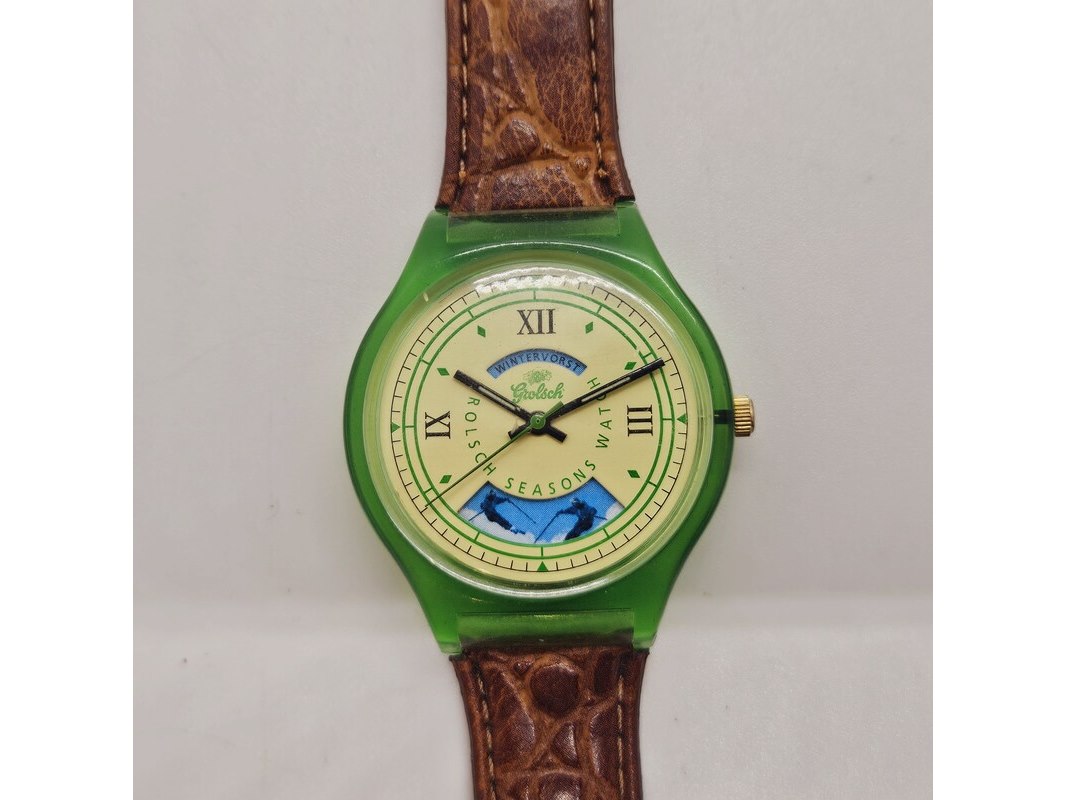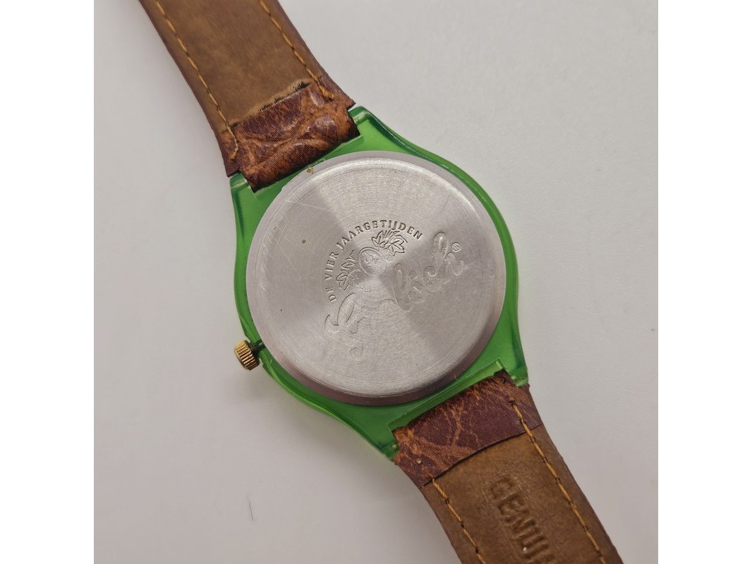 Product: Grolsch Four Seasons verzamelaars horloge Afmeting: 38mm Conditie: Gebruikt Specificaties: Quartz uurwerk loopt goed. Merk: Grolsch. Model: Four Seasons. 4 afgebeelde seizoenen op de wijzerplaat. Heeft gebruikssporen.