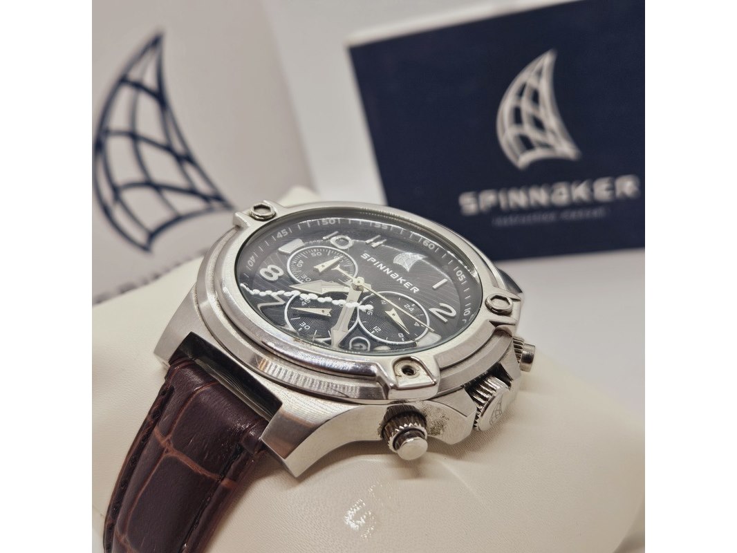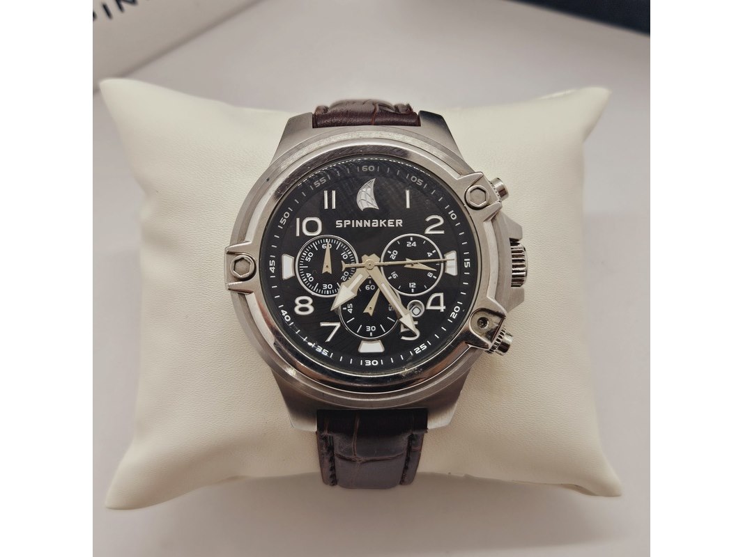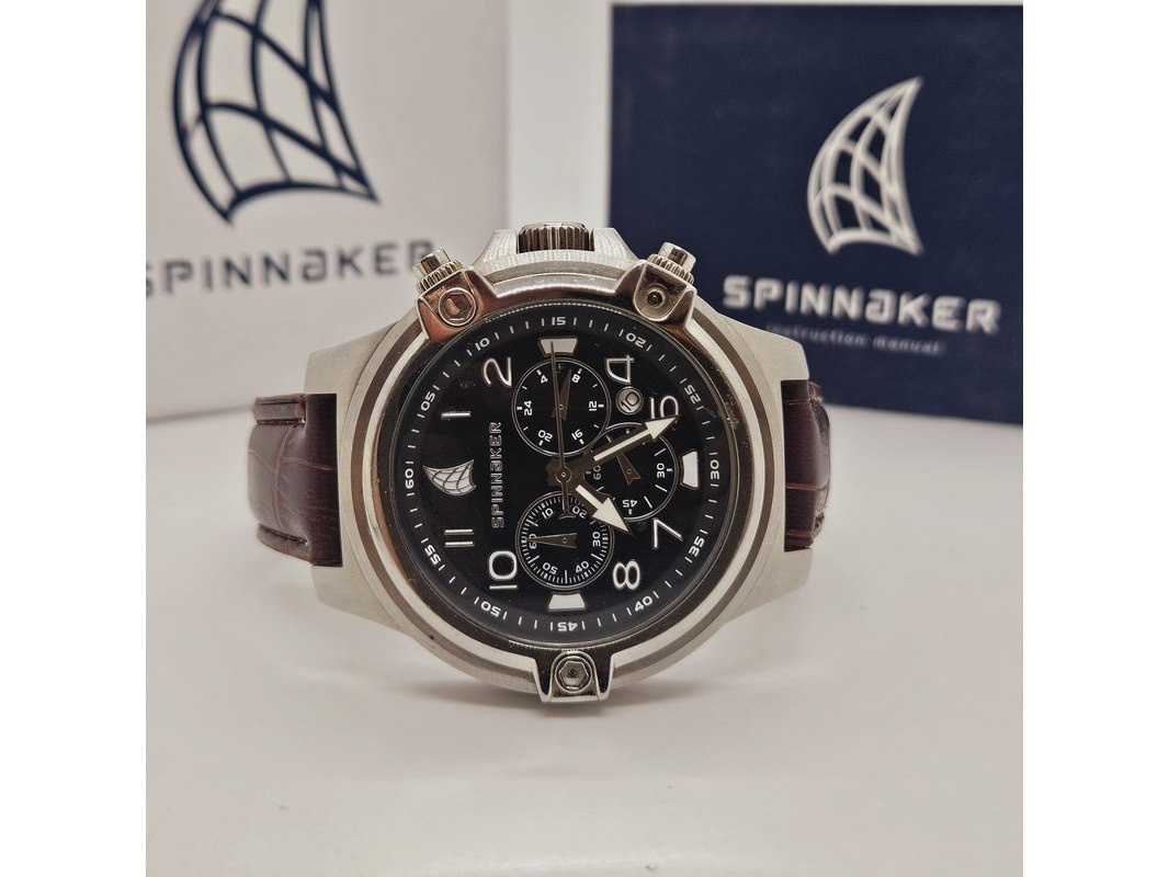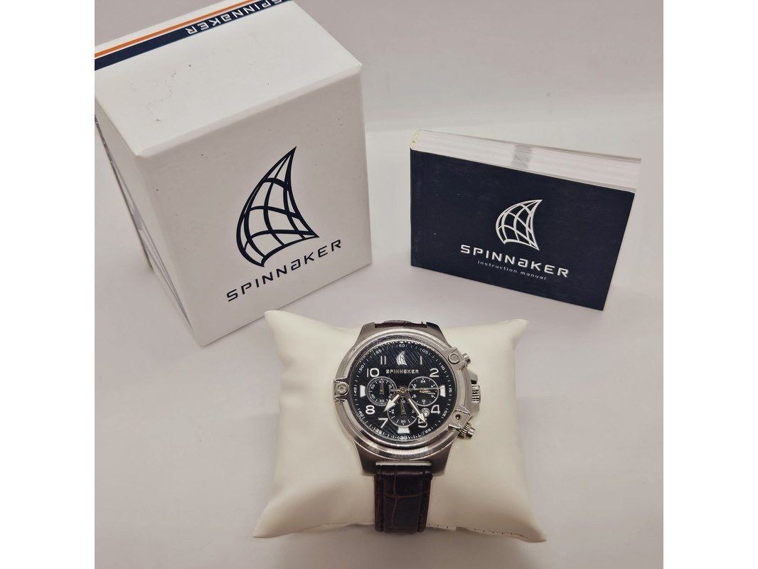 Product: Spinnaker SP-70332 chronograaf herenhorloge Afmeting: 46mm Conditie: Gebruikt Specificaties: Quartz uurwerk loopt goed. Merk: Spinnaker. Ref. nummer: SP-70332. Chronograaf herenhorloge. Heeft gebruikssporen. Inclusief Spinnaker doos.