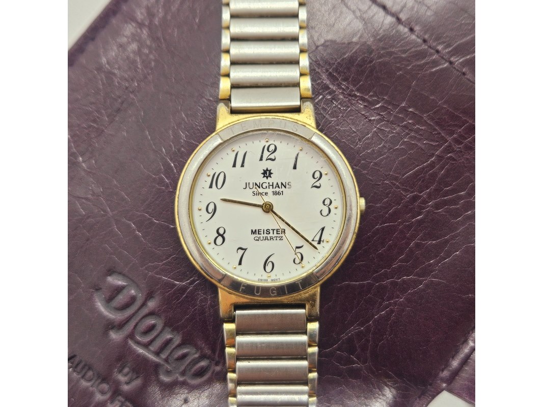 Product: Junghans Meister Quartz two tone horloge Afmeting: 32mm Conditie: Gebruikt Specificaties: Werkend getest op een quartz-tester, heeft een nieuwe batterij nodig. Merk: Junghans. Model: Meister Quartz. Heeft gebruikssporen. Inclusief lederen Claudio Ferrici etui.