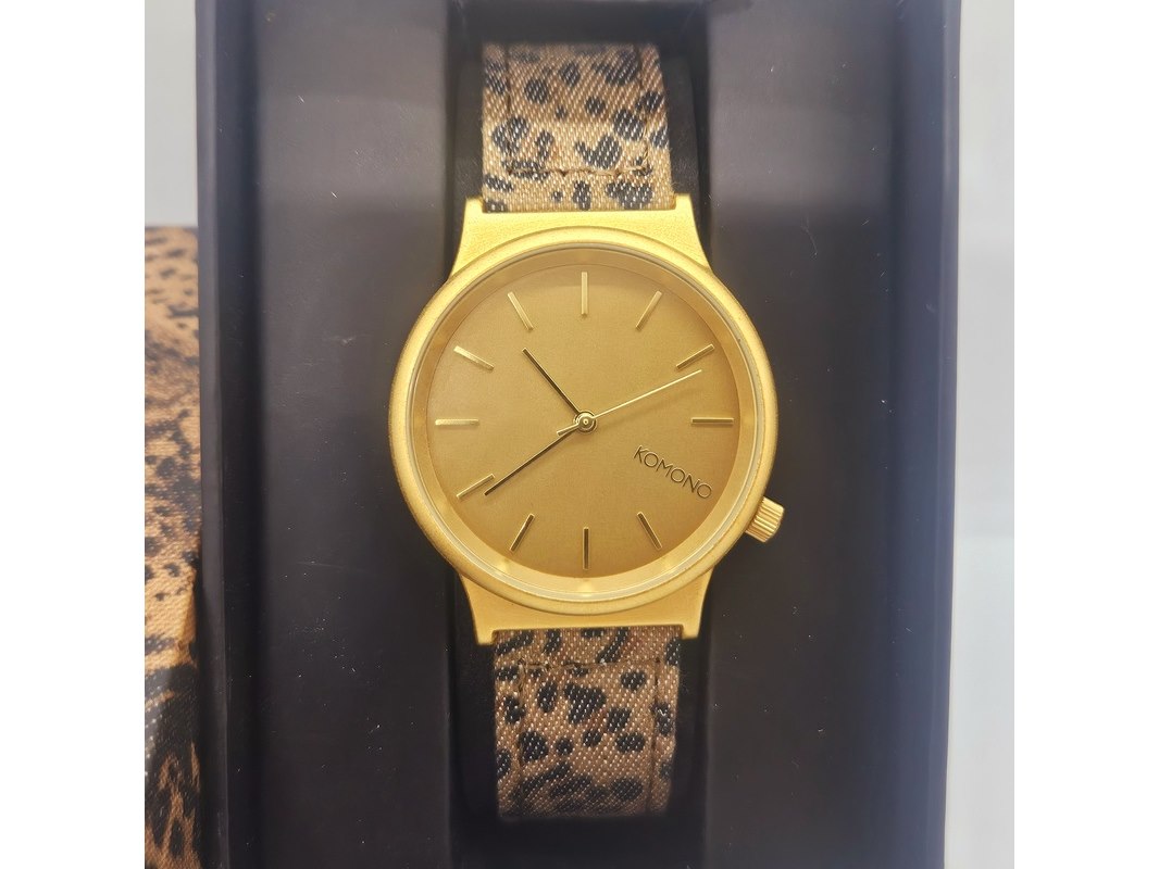 Product: Komono Wizard Leopard horloge Afmeting: 37mm Specificaties: Werkend getest onder een quartz-tester, heeft een nieuwe batterij nodig. Merk: Komono. Model: Wizard Leopard. Inclusief doos. New old stock.