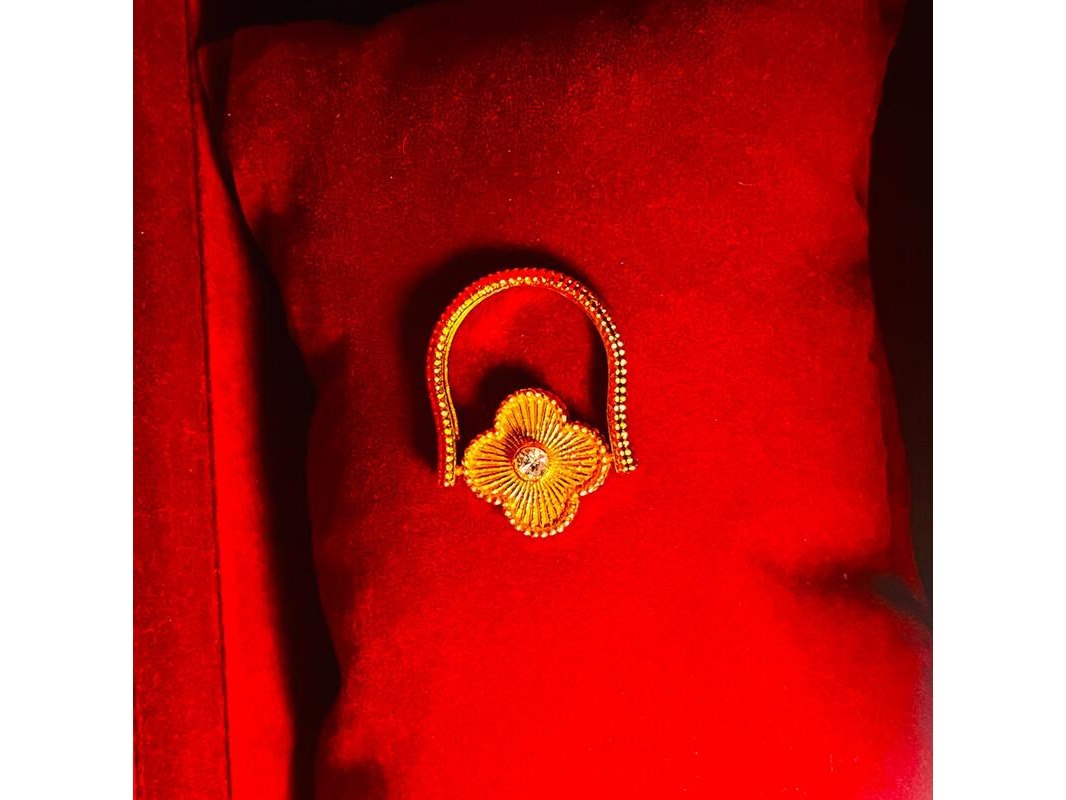 Product: Klassieke Alhambra model dames ring Conditie: Gebruikt Specificaties: Goudkleurig staal met steen. In klassiek Alhambra model.