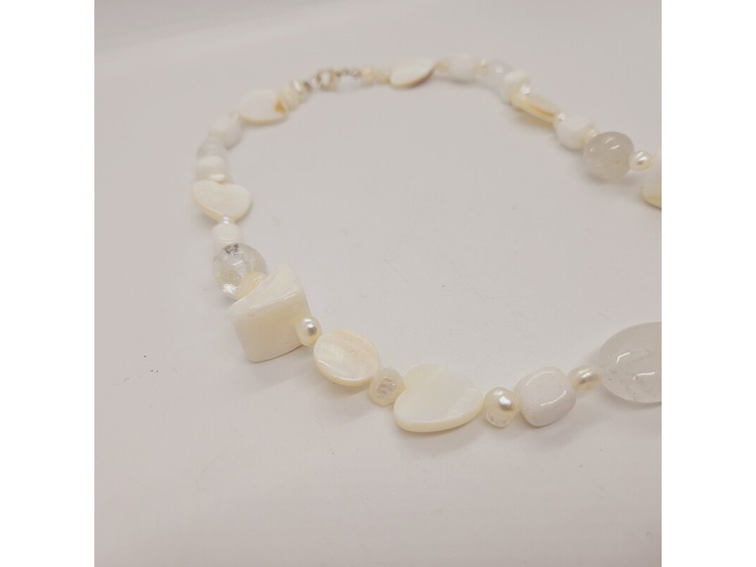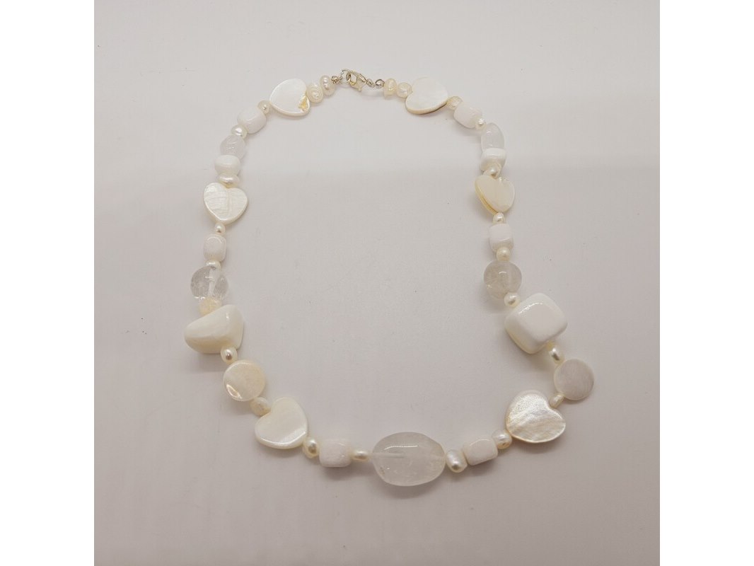 Collier witte jade, zoetwater parels, gepolijst parelmoer en kristallen