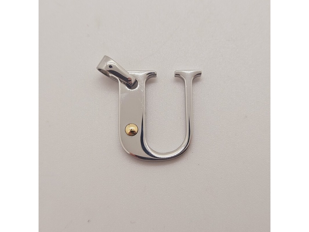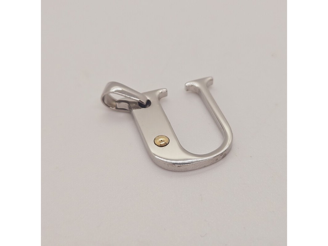 Product: Pendant staal met .750 goud. Afmeting: 22mm x 22mm Conditie: Gebruikt Specificaties: Staal met goud keurmerk.
