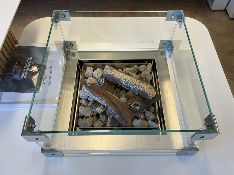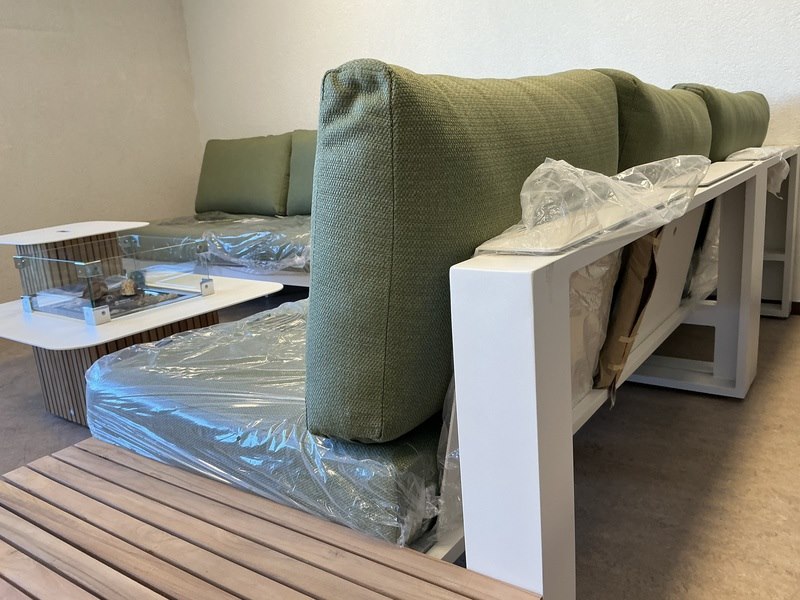 Merk: Suns Product: Lounge set Kleur: mat white/forest green Conditie: nieuw Specificaties: 2 zits links, 3 zits rechts, totale hoekopstelling 360x280cm, vuurtafel 80x80cm, tafel voor gasfles 50x50x55cm