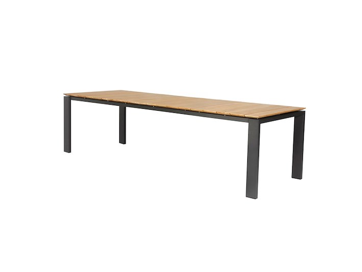 Merk: Suns Product: Tuintafel Kleur: mat royal grey Materiaal: aluminium met teak Afmeting: 280x100cm Conditie: nieuw