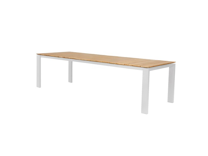 Merk: Suns Product: Tuintafel set Kleur: mat white Materiaal: aluminium met teak Afmeting: tafel 280x100cm, bank 250cm Conditie: nieuw