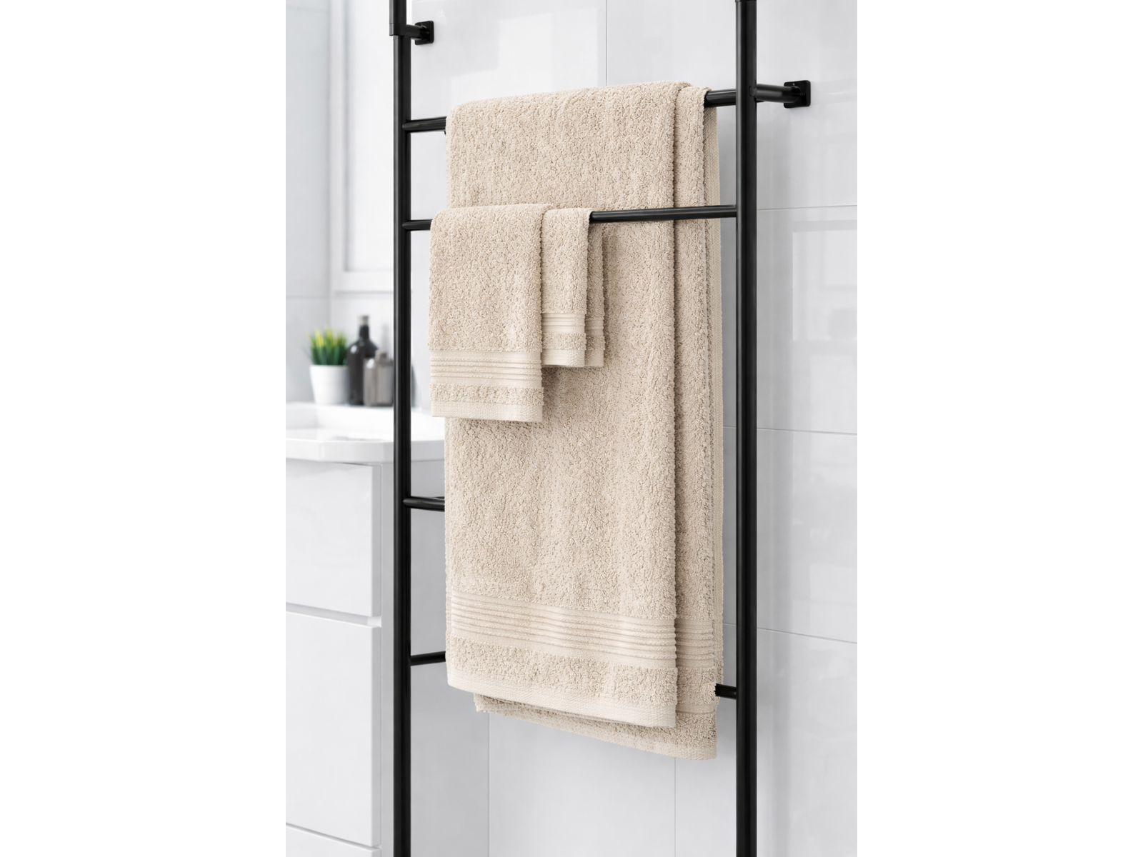 Merk: Lux-Towels Product: Handdoeken set 3-delig Kleur: Beige Materiaal: 80% katoen, 20% polyester Conditie: nieuw Specificaties: 1x 40x60cm, 1x 50x90cm, 1x 70x140cm