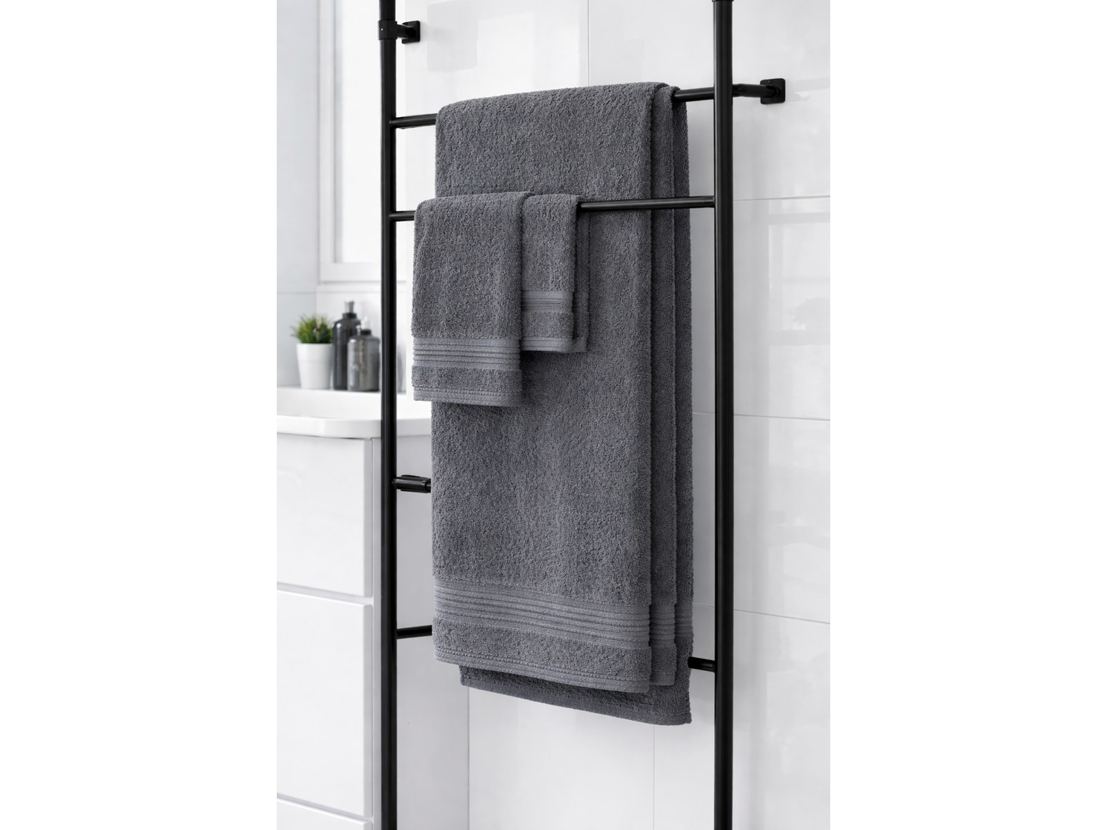 Merk: Lux-Towels Product: Handdoeken set 3-delig Kleur: Grijs Materiaal: 80% katoen, 20% polyester Conditie: nieuw Specificaties: 1x 40x60cm, 1x 50x90cm, 1x 70x140cm