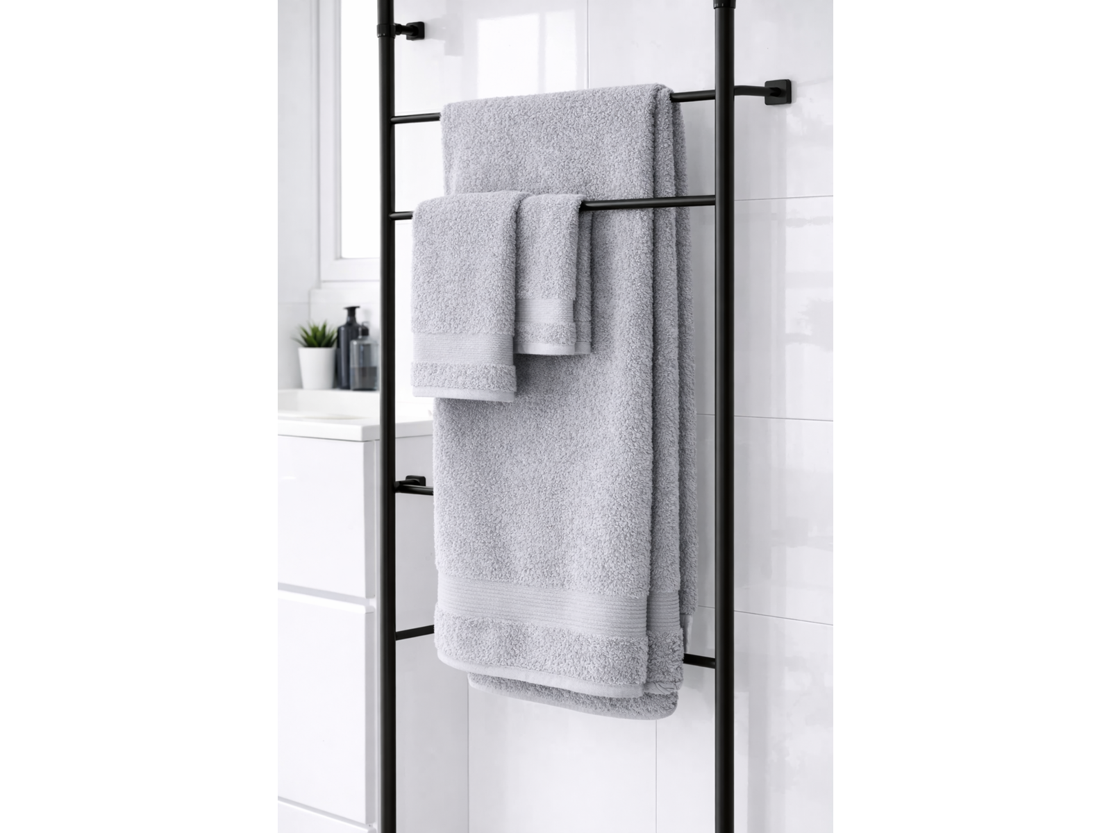 Merk: Lux-Towels Product: Handdoeken set 3-delig Kleur: licht grijs Materiaal: 80% katoen, 20% polyester Conditie: nieuw Specificaties: 1x 40x60cm, 1x 50x90cm, 1x 70x140cm