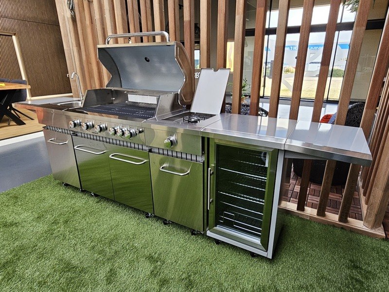 Merk: Vonato Product: Gasbarbecue Kleur: zilverkleurig, rvs (mat) Materiaal: RVS BBQ, Gietijzeren rooster Conditie: nieuw Specificaties: Aantal: 1 Merk: Vonato Productnaam: Gasbarbecue buitenkeuken Type: JFK-005 Model: RVS Gasbarbecue – Complete buitenkeuken Kleur: Zilverkleurig Materiaal: RVS BBQ, Gietijzeren rooster Afmetingen: B:308 x H118 x D:55 cm. 130 kg. Grilloppervlak: 90x48 cm Voorzien van: 6 Hoofdbranders en 1 extra gaspit – Draaispit – Koelkast – Wasbak met kraan – Verlichting - Gietijzeren rooster - Gietijzeren kookplaat – Warmhoudrek - Elektrische ontsteking - Deksel voorzien van thermometer - Wieltjes - Opbergruimte in 4 kastjes.