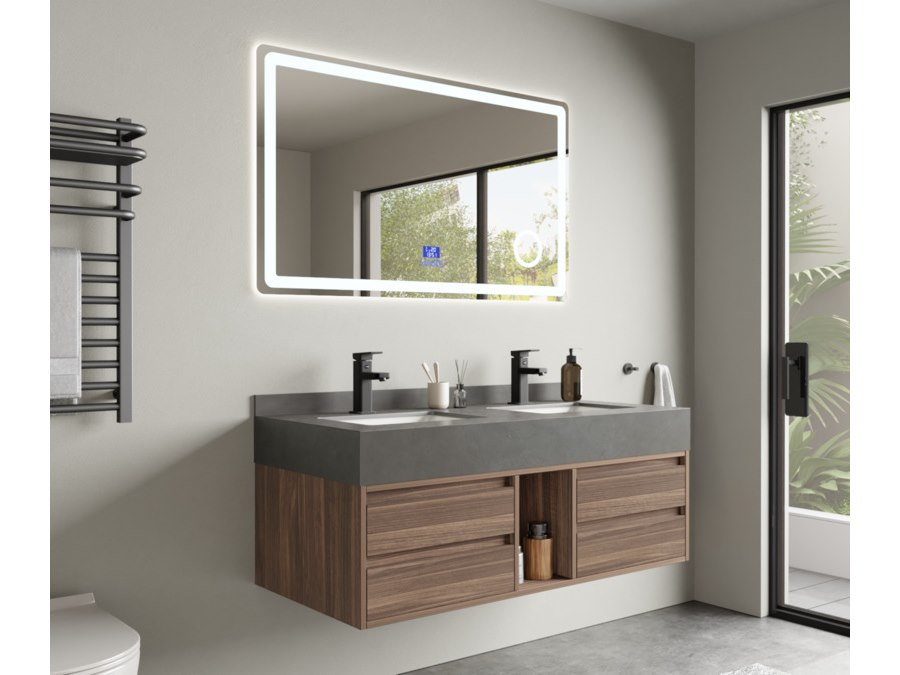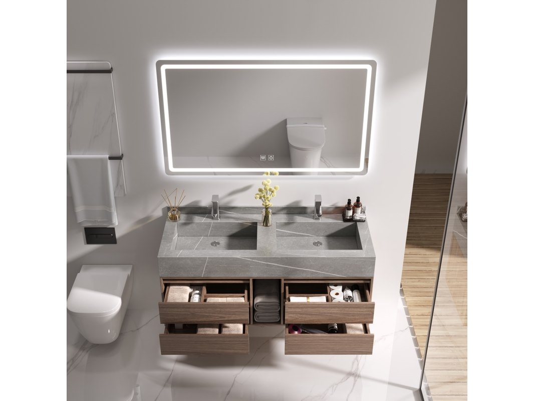 Merk: Vonato Product: Badkamermeubel Kleur: donker hout decor Materiaal: Meubel: Multiplex met melamine Wasbak: Marmer Conditie: nieuw Specificaties: Aantal: 1 Merk: Vonato Productnaam: Badkamermeubel Type: MBY-412 Model: 2-persoons badkamermeubel 120 cm donker hout decor met marmeren wasbak Kranen: Inclusief 2 opzetkranen Materiaal: Meubel: Multiplex met melamine, Wasbak: Marmer Afmeting: 2-persoons set: 1 * Wastafelmeubel - 1200x550x550mm 1 * Spiegel - ca. 1200x700mm Kleur: Donker hout decor, grijze wasbak Voorzien van: Softclose lade systeem: 4 lades - Kranen inclusief pop-up afvoer - Spiegel met touchscreen LED-verlichting en anti-fog technologie - Voorgemonteerd wastafelmeubel.