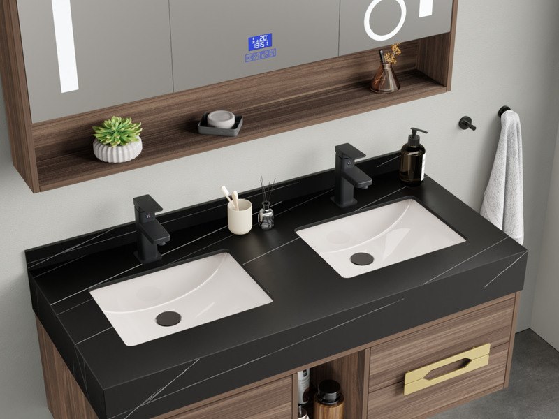 Merk: Vonato Product: Badkamermeubel Kleur: hout decor Materiaal: Melamine, MDF, metaal Conditie: nieuw Specificaties: Aantal: 1 Merk: Vonato Productnaam: Badkamermeubel Type: MBY-312-WM. Kranen: Inclusief mat zwarte opzetkranen Kleur: Hout / zwarte wasbak / wit basin Materiaal: Melamine kasten, natuurstenen wasbak Afmeting: 2-persoons set: 1 * Wastafelmeubel - 1200x550x430mm, 1* Wastafel – 1200x555x150mm, 1 * Spiegelkast - ca. 1200x160x700mm. Voorzien van: Softclose lade systeem: 4 stevige metalen lades - Zwarte kranen inclusief pop-up drains (chrome) - Goudkleurige metalen handgrepen - Spiegel met: touchscreen LED-verlichting in 3 kleuren, dimbaar, digitale klok + thermometer, Bluetooth + speakers, anti-fog technologie, kopervrije spiegel - Voorgemonteerd wastafelmeubel.