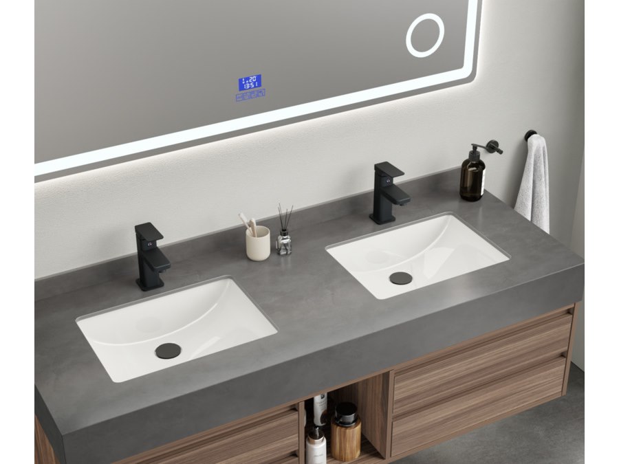 Merk: Vonato Product: Badkamermeubel Kleur: hout decor Materiaal: Multiplex, melamine, metalen lades Conditie: nieuw Specificaties: Aantal: 1 Merk: Vonato Productnaam: Badkamermeubel Type: MBY-415-WM. Kranen: Inclusief mat zwarte opzetkranen Kleur: Hout / grijze wasbak / wit basin Materiaal: Melamine kasten, natuurstenen wasbak Afmeting: 2-persoons set: 1 * Wastafelmeubel - 1500x550x430mm, 1* Wastafel – 1500x555x150mm, 1 * Spiegel - ca. 1500x35x700mm. Voorzien van: Softclose lade systeem: 4 stevige metalen lades - Zwarte kranen inclusief pop-up drains (chrome) - Goudkleurige metalen handgrepen - Spiegel met: touchscreen LED-verlichting in 3 kleuren, dimbaar, digitale klok + thermometer, Bluetooth + speakers, anti-fog technologie, kopervrije spiegel - Voorgemonteerd wastafelmeubel.