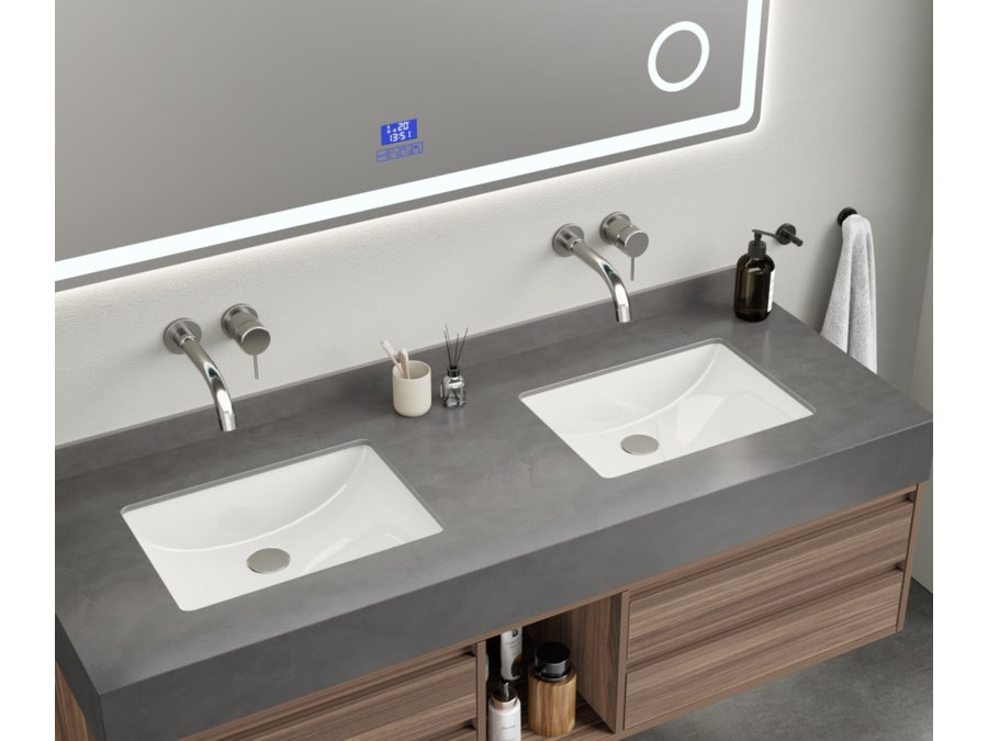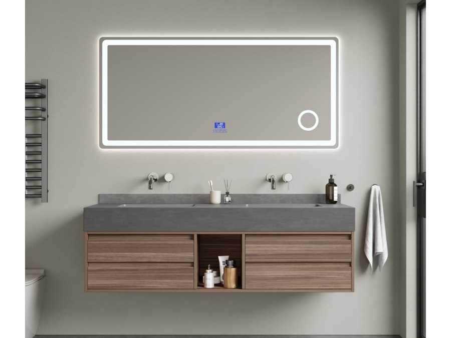 Merk: Vonato Product: Badkamermeubel Kleur: hout decor Materiaal: Multiplex, melamine, metalen lades Conditie: nieuw Specificaties: Aantal: 1 Merk: Vonato Productnaam: Badkamermeubel Type: MBY-415W-WM Kranen: Inclusief muurkranen Kleur: Hout / grijze wasbak / wit basin Materiaal: Melamine kasten, natuurstenen wasbak Afmeting: 2-persoons set: 1 * Wastafelmeubel - 1500x550x430mm, 1* Wastafel – 1500x555x150mm, 1 * Spiegel - ca. 1500x35x700mm Voorzien van: Softclose lade systeem: 4 stevige metalen lades - Muurkranen inclusief pop-up drains (chrome) - Goudkleurige metalen handgrepen - Spiegel met: touchscreen LED-verlichting in 3 kleuren, dimbaar, digitale klok + thermometer, Bluetooth + speakers, anti-fog technologie, kopervrije spiegel - Voorgemonteerd wastafelmeubel.