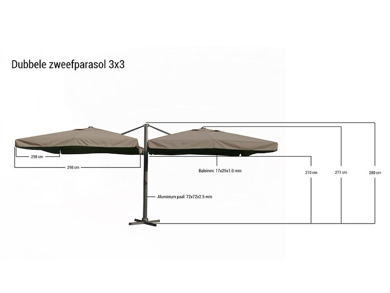 Merk: Paralux Product: Parasol Kleur: zand Materiaal: Aluminium frame, 200 grams brandvertragend doek Conditie: nieuw Specificaties: Aantal: 1 Merk: Vonato Productnaam: Parasol Type: U1073 DOUBLE 3X3 SANDY Afmeting: 2x 3000x3000mm Model: Dubbel hangend Kleur: Zandkleurig Materiaal: Aluminium frame, 200 gram/m2 brandvertragend doek Productbeschrijving: De parasol is ideaal voor gebruik in de tuin, terras en balkon. De grote parasol wordt geleverd met een parasolvoet. Deze moet wel worden verzwaard met behulp van bijvoorbeeld terrastegels. Houd hiervoor minimaal een gewicht van 100 kilo aan. Voorzien van: Groot dubbel parasoldoek met een afmeting van tweemaal ø300 cm. - Sterk en stevig frame gemaakt van aluminium. - Eenvoudig startklaar te zetten voor gebruik. - Brandvertragend, dik doek voor een betere UV-bescherming. - De parasol houdt de warmte van de zon vast waardoor het ook ’s avonds nog lekker warm is wanneer de zon ondergaat. - De parasol kan 360 graden om zijn as draaien, zo kan de parasol makkelijk meedraaien met de zon en maak je optimaal gebruik van de parasol.