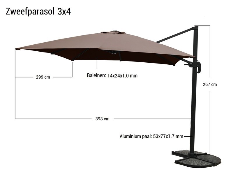 Merk: Paralux Product: Parasol Kleur: donkergrijs Materiaal: Aluminium frame, 200 grams brandvertragend doek Conditie: nieuw Specificaties: Aantal: 1 Merk: Vonato Productnaam: Parasol Type: U1072 3X4 DGR Afmeting: 3000x4000mm Model: Hangend, zonder flappen Kleur: Donkergrijs Materiaal: Aluminium frame, 200 gram/m2 brandvertragend doek Productbeschrijving: De parasol is ideaal voor gebruik in de tuin, terras en balkon. De grote parasol wordt geleverd met een parasolvoet. Deze moet wel worden verzwaard met behulp van bijvoorbeeld terrastegels. Houd hiervoor minimaal een gewicht van 60 kilo aan. Voorzien van: Groot parasoldoek met een afmeting van 300x400 cm. - Sterk en stevig frame gemaakt van aluminium. - Eenvoudig startklaar te zetten voor gebruik. - Brandvertragend, dik doek voor een betere UV-bescherming. - De parasol houdt de warmte van de zon vast waardoor het ook ’s avonds nog lekker warm is wanneer de zon ondergaat. - De parasol kan 360 graden om zijn as draaien, zo kan de parasol makkelijk meedraaien met de zon en maak je optimaal gebruik van de parasol.