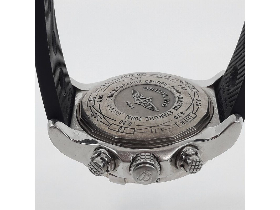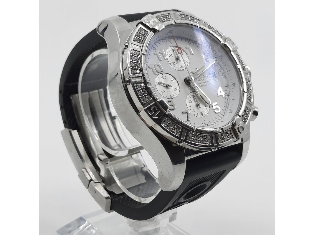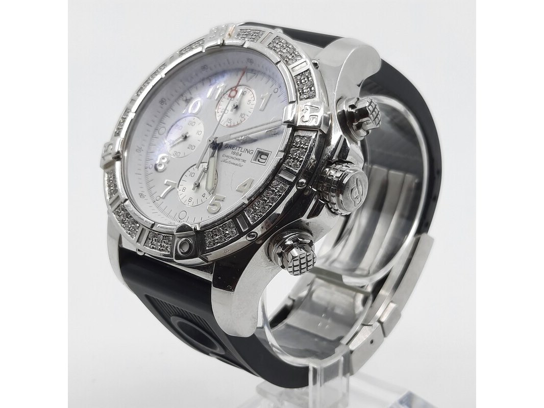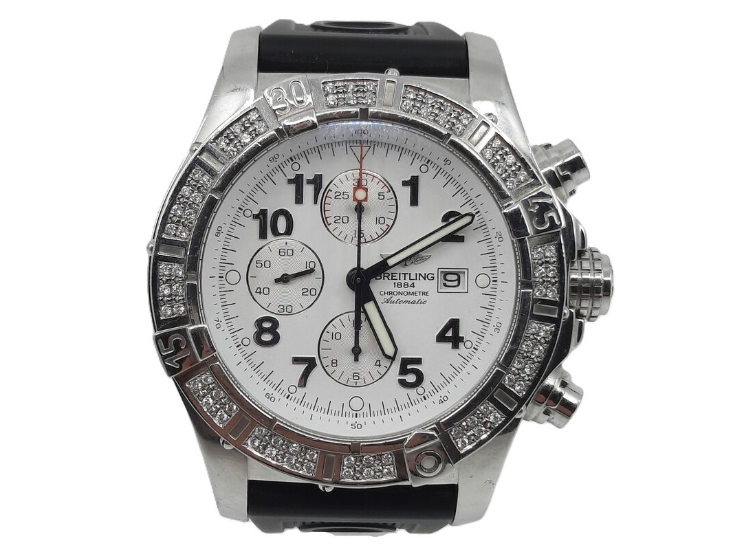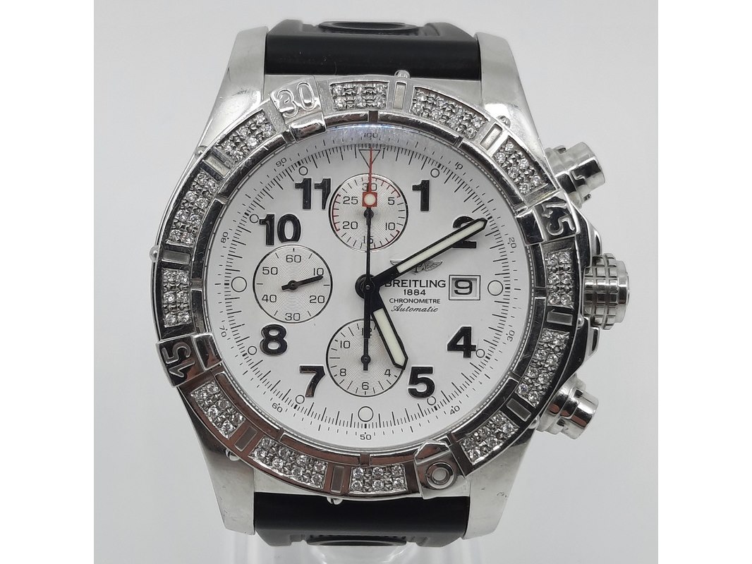 Merk: Breitling Product: Heren polshorloge Conditie: Gebruikt Specificaties: Een stalen heren polshorloge, Breitling Super Avenger. Met witte wijzerplaat, 104 briljant geslepen diamantjes op de bezel, datum en chronograaf en rubberen band met stalen vouwsluiting. Geen doos en geen certificaat. Let op, Horlogekast is niet te opnenen!