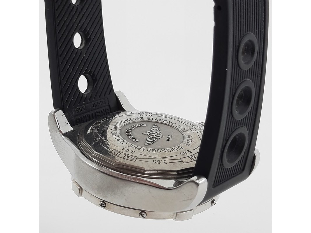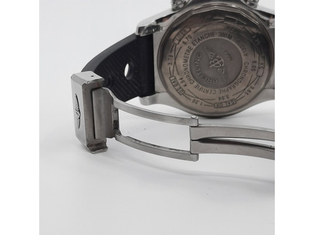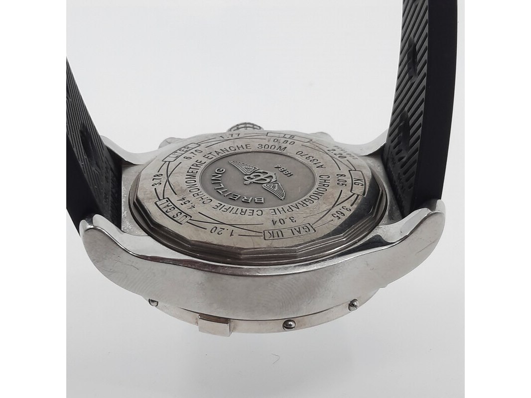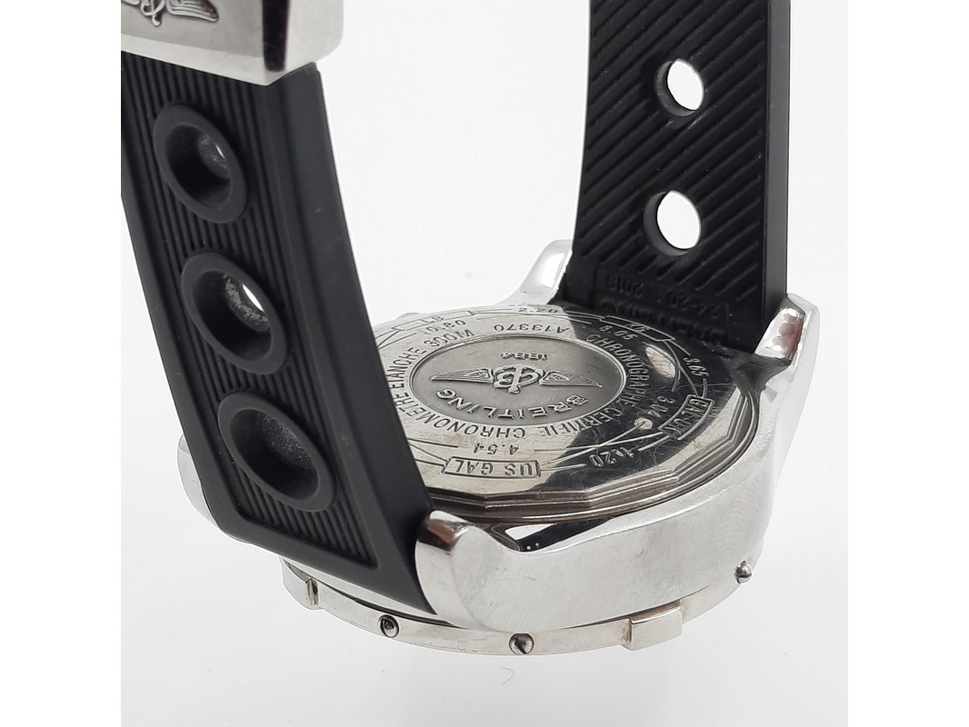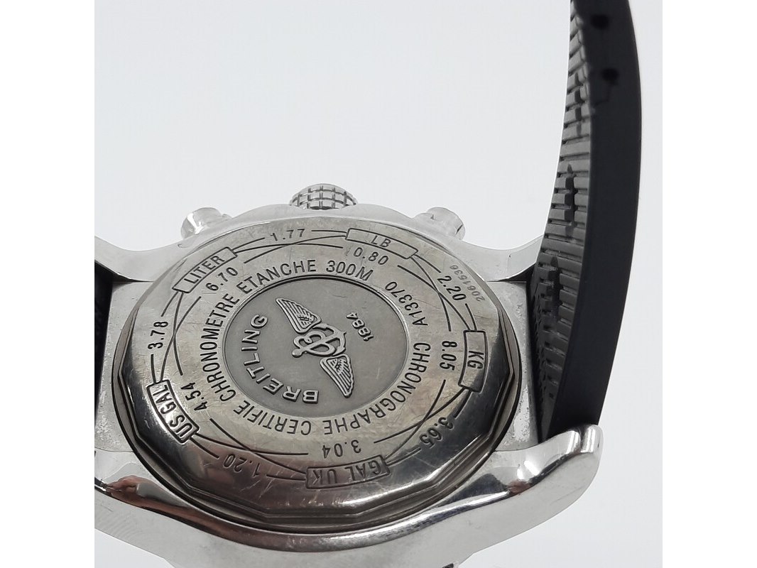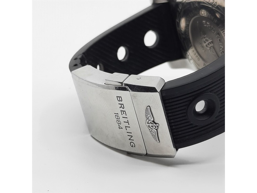 Merk: Breitling Product: Heren polshorloge Conditie: Gebruikt Specificaties: Een stalen heren polshorloge, Breitling Super Avenger. Met witte wijzerplaat, 104 briljant geslepen diamantjes op de bezel, datum en chronograaf en rubberen band met stalen vouwsluiting. Geen doos en geen certificaat. Let op, Horlogekast is niet te opnenen!