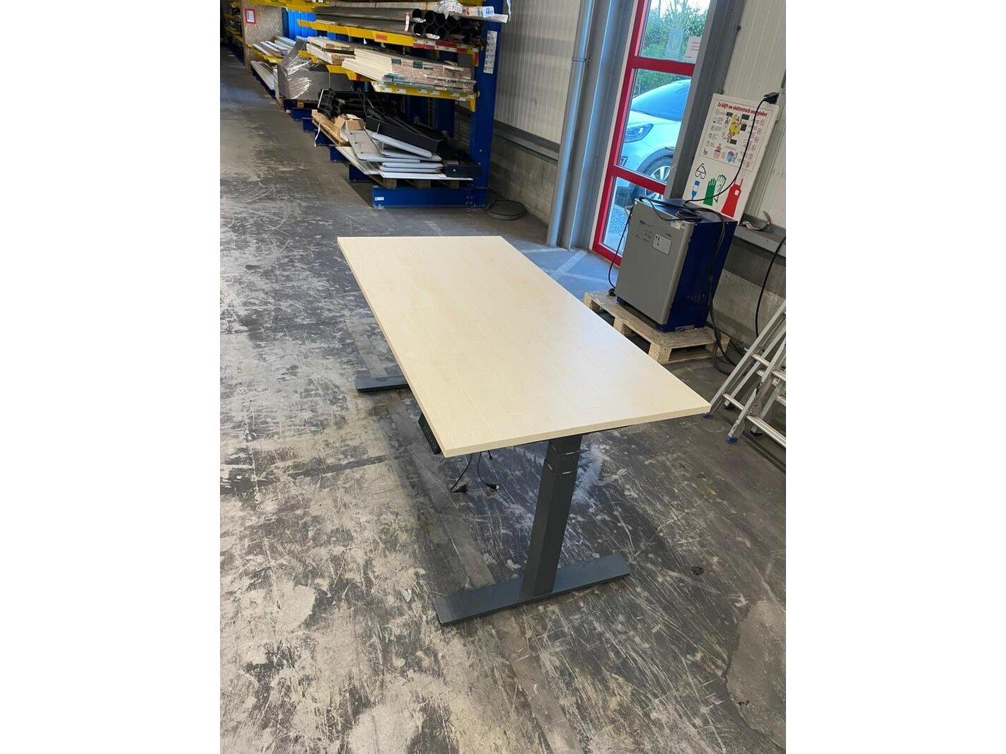 Product: Zit sta bureau Kleur: lichte kleur hout Materiaal: metaal/ hout Afmeting: 800x1600 Conditie: gebruikt Specificaties: Zit sta bureau op hoogte in te stellen met 4 geheugenstanden metalen onderstel