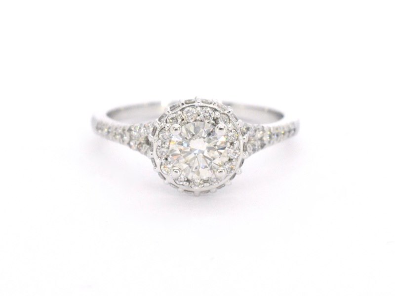Product: Witgouden entourage ring met diamanten Specificaties: Diamant: Natuurlijk Aantal: 1 stuk Slijpvorm: Briljant geslepen Gewicht (carat): 0.50 carat Kleur: D Zuiverheid: VS-SI Slijpkwaliteit: Zeer mooi Diamant (secundair): Diamanten Aantal diamanten: 65 stuks Slijpvorm: Briljant geslepen Gewicht (carat): 0.65 carat Kleur: F Zuiverheid: VS Slijpkwaliteit: Zeer mooi Juweel: Ring Gewicht: 3.6 gram Ringmaat (op maat gemaakt*): 53 (17 mm) Materiaal: 18K goud (750) Conditie: Zo goed als nieuw Verpakking: Luxe sieradendoos Toelichting: De kwaliteit is overgenomen van het rapport behorend bij item. De waardebepaling is een beoordeling van een gecertificeerde diamantair, gebaseerd op consumentenprijzen. Consumentenprijs: € 9.750,-