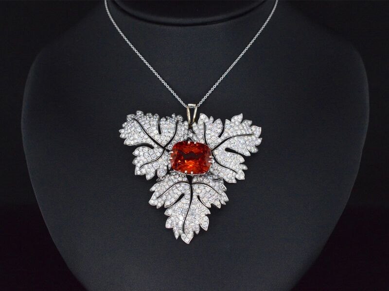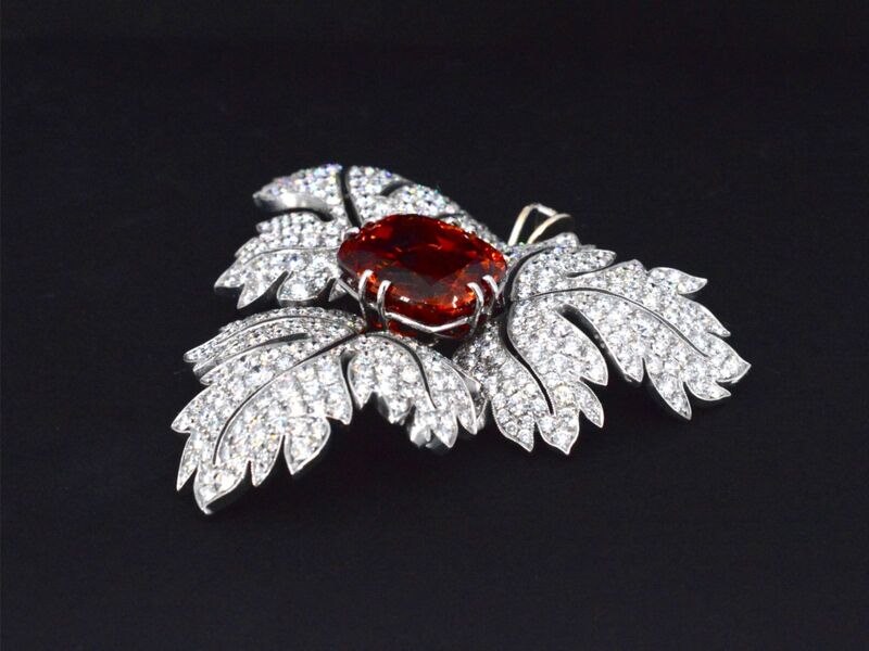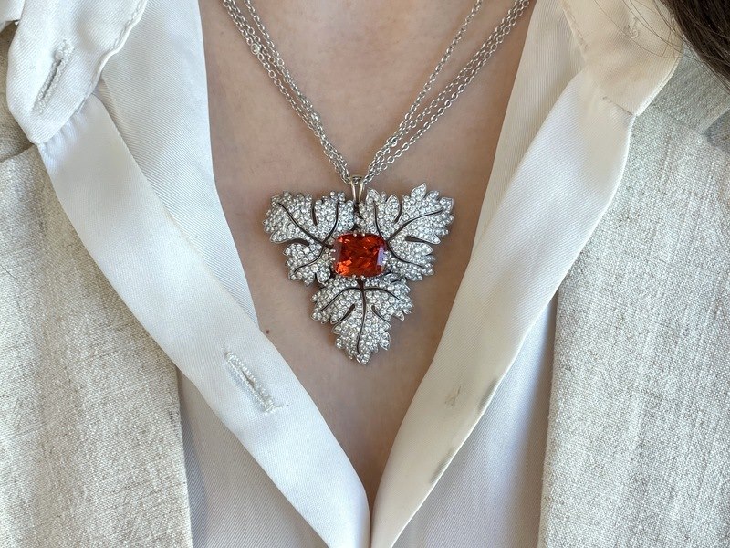 Product: Witgouden hanger met diamanten en edelsteen spessartien van 13 carat Specificaties: Diamant: Natuurlijk Aantal: ca. 435 stuks Slijpvorm: Briljant geslepen Gewicht (carat): 10.00 carat Kleur: D-E Zuiverheid: VVS-Zuiver Slijpkwaliteit: Zeer mooi-Excellent Edelsteen: Spessartien granaat (zeldzaam) Slijpvorm: Kussenvorm geslepen Gewicht (carat): 13.38 carat Kleur: Oranje Zuiverheid: Met natuurlijke insluitsels Juweel: Hanger (excl. ketting) Gewicht: 7.6 gram Materiaal: Platina en 18k goud (750) Conditie: Zo goed als nieuw Verpakking: Luxe sieradendoos Toelichting: De kwaliteit is overgenomen van het rapport behorend bij item. De waardebepaling is een beoordeling van een gecertificeerde diamantair, gebaseerd op consumentenprijzen. Consumentenprijs: € 72.000,-