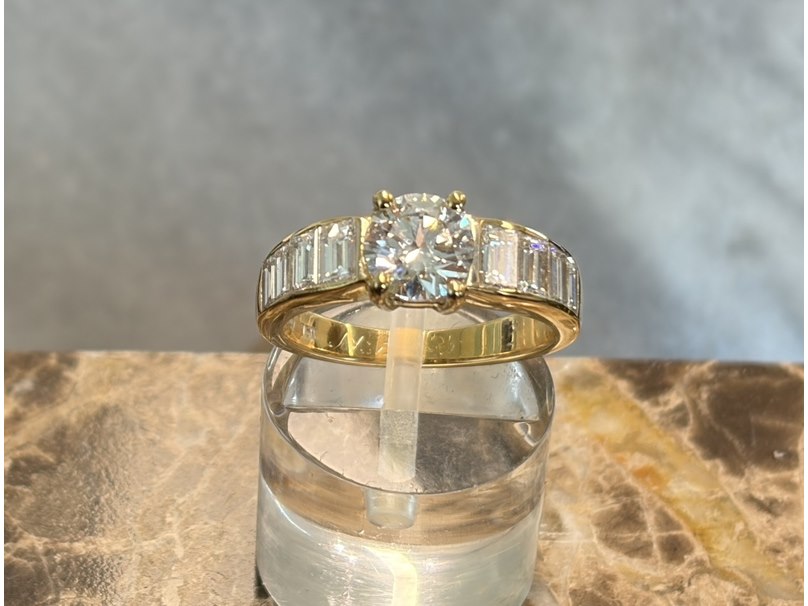 Product: Gouden ring met diamanten Specificaties: Diamant: Eco (Lab-grown) Aantal: 1 stuks Slijpvorm: Briljant geslepen Gewicht (carat): 1.00 carat Kleur: E-F Zuiverheid: VVS Slijpkwaliteit: Excellent Certificaat: IGI Certificaat nummer: LG644432148 Diamant (secundair): Natuurlijk Aantal diamanten: 8 stuks Slijpvorm: Baquette geslepen Gewicht (carat): 0.60 carat Kleur: E-F Zuiverheid: VVS Slijpkwaliteit: Heel mooi Juweel: Ring Gewicht: 4.0 gram Materiaal: 18K goud (750) Conditie: Zo goed als nieuw Verpakking: Luxe sieradendoos Toelichting: De kwaliteit is overgenomen van het rapport behorend bij item. De waardebepaling is een beoordeling van een gecertificeerde diamantair, gebaseerd op consumentenprijzen. Consumentenprijs: € 12.000,-