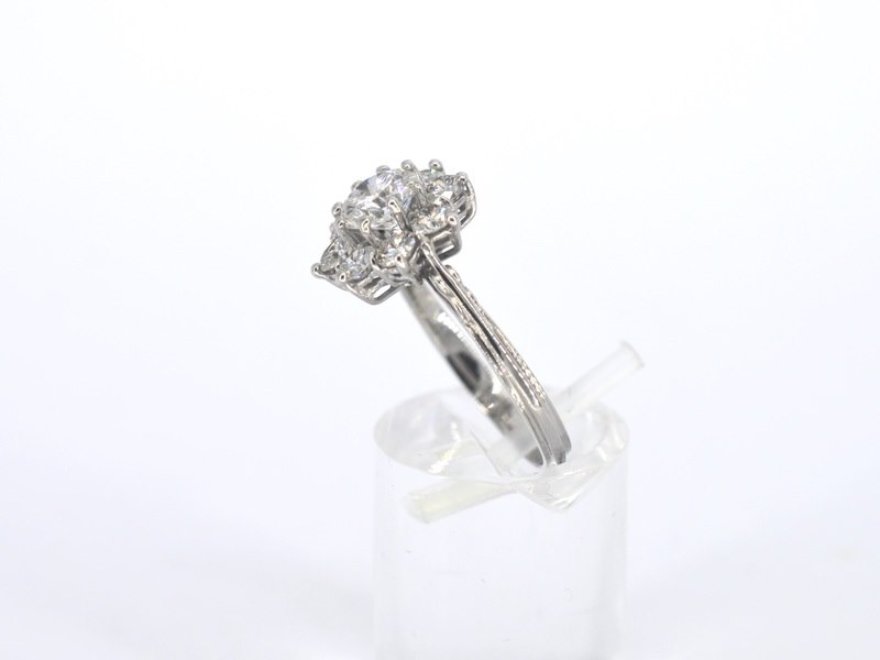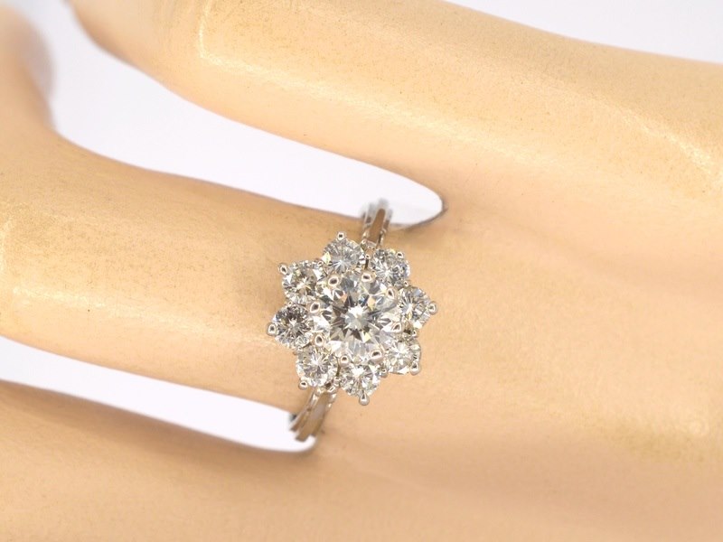Product: Witgouden ring met diamanten Specificaties: Diamant: Natuurlijk Aantal: 1 stuk Slijpvorm: Briljant geslepen Gewicht (carat): 1.00 carat Kleur: E Zuiverheid: SI2 Slijpkwaliteit: Zeer mooi Diamant (secundair): Natuurlijk Aantal diamanten: 8 stuks Slijpvorm: Briljant geslepen Gewicht (carat): 0.80 carat Kleur: E-F Zuiverheid: VS-SI Slijpkwaliteit: Zeer mooi Juweel: Ring Gewicht: 3.5 gram Ringmaat (op maat gemaakt*): 53 (17 mm) Materiaal: 18K goud (750) Conditie: Nieuw Verpakking: Luxe sieradendoos Toelichting: De kwaliteit is overgenomen van het rapport behorend bij item. De waardebepaling is een beoordeling van een gecertificeerde diamantair, gebaseerd op consumentenprijzen. Consumentenprijs: € 16.000,-