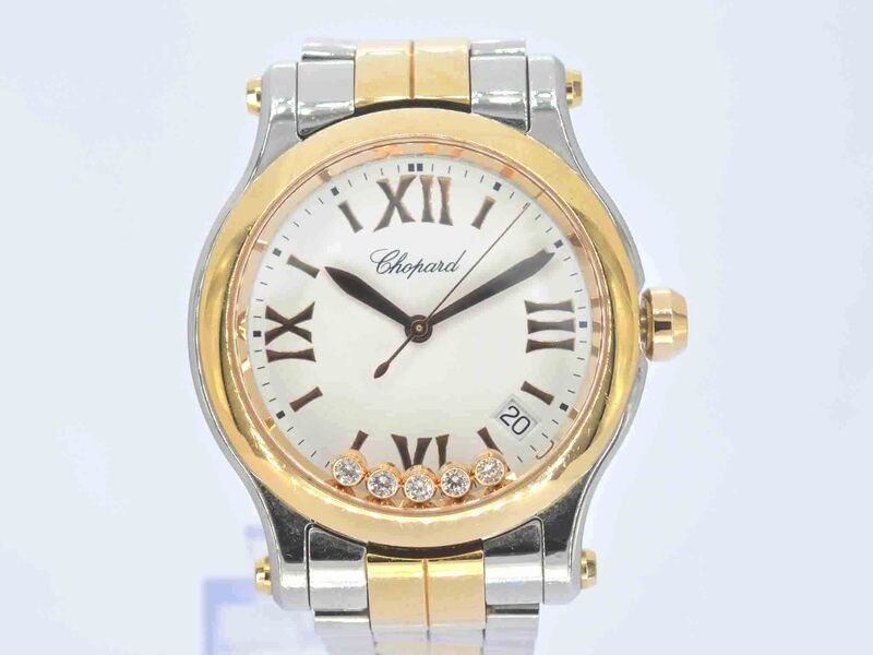 Product: Chopard - Happy sports horloge met diamanten Specificaties: Diamant: Natuurlijk Aantal: 5 stuks Slijpvorm: Briljant geslepen Gewicht (carat): 0.24 carat Kleur: F-G Zuiverheid: IF-VVS Slijpkwaliteit: Exceptioneel Horloge (Merk): Chopard Model: Happy sport Referentie: 278582-6002 Jaar: 2001 Wijzerplaat: Wit Klok (type): Quartz Kast doorsnede: 33 mm Materiaal: Rosegoud en staal Toebehoren: Orginele doos en papieren Juweel: Horloge Gewicht: 119 gram Afmetingen/lengte: 19 - 20 cm Materiaal: Goud en staal Conditie: Mooi Verpakking: Orginele doos Toelichting: De kwaliteit is overgenomen van het rapport behorend bij item. De waardebepaling is een beoordeling van een gecertificeerde diamantair, gebaseerd op consumentenprijzen. Consumentenprijs: € 17.800,-