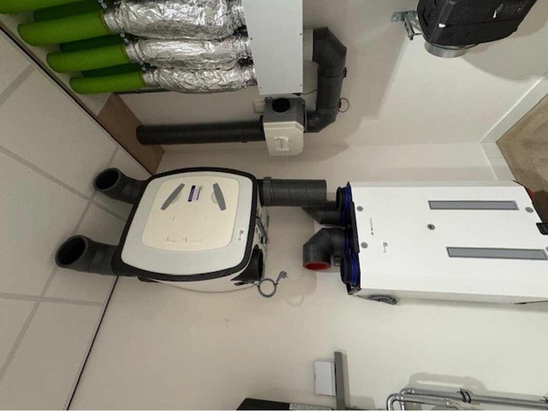 Product: Wtw unit Afmeting: (hxbxd) ca.80 x 73 x 47 cm Specificaties: 230V, 154W, 350 m3/h, demo model, bevestigd aan de muur