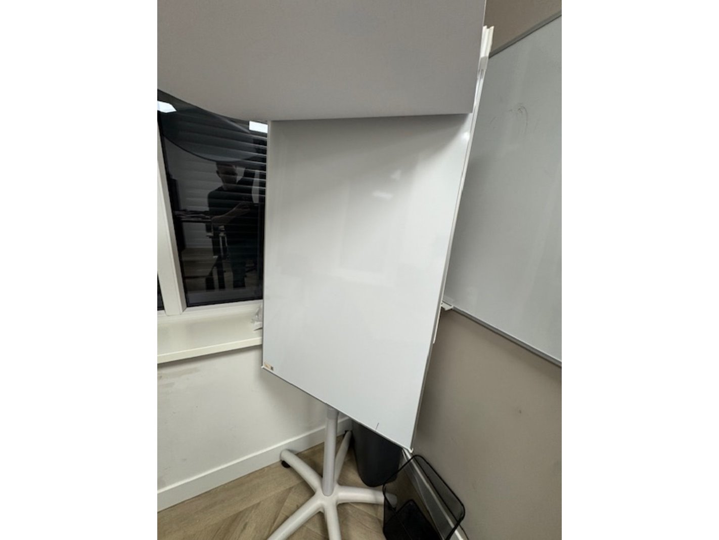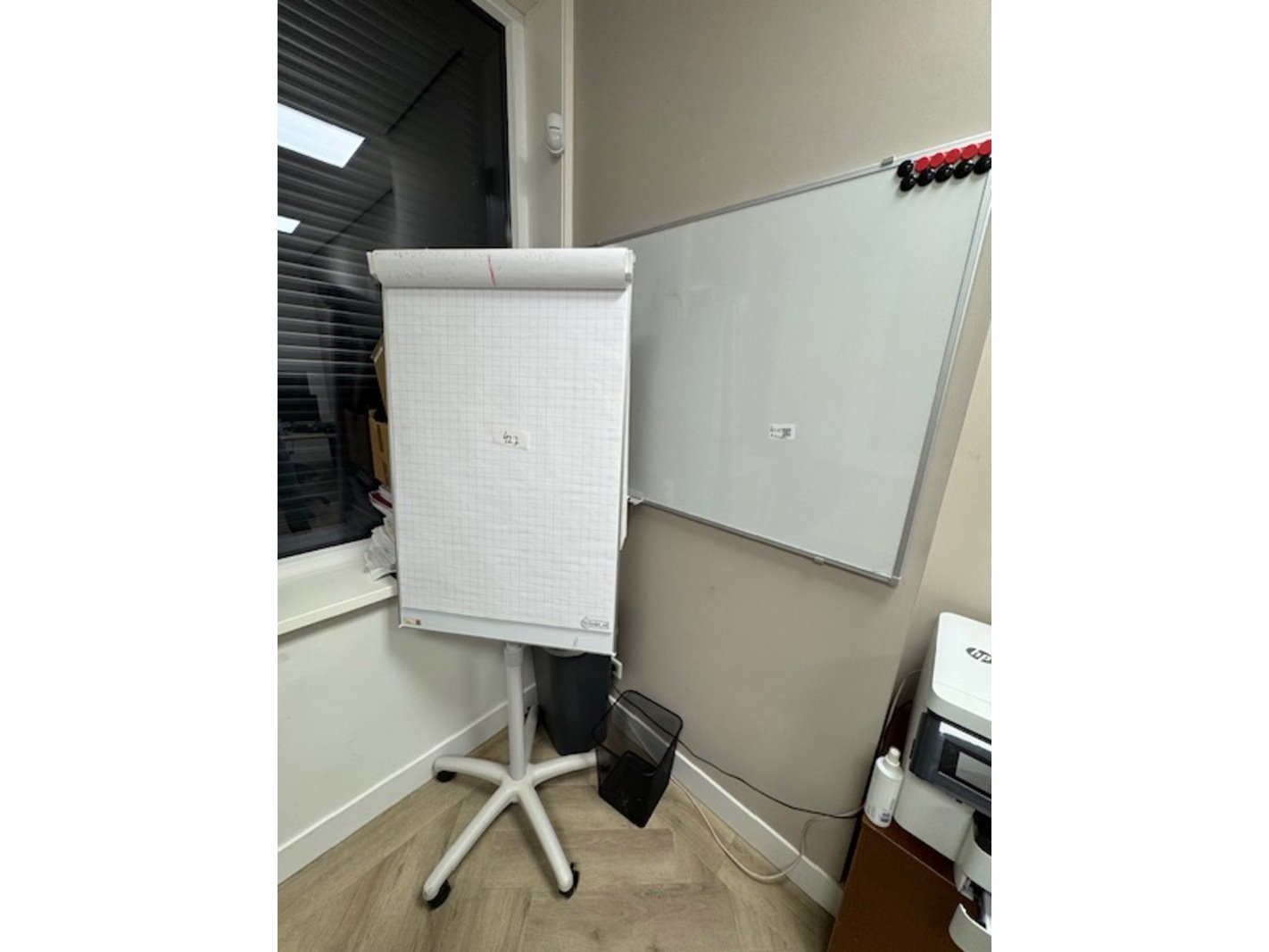 Product: Kantoorartikel Specificaties: Bestaande uit whiteboard (hxb) ca. 90 x 120cm, flipover chart hoogte ca. 185 cm, 2x prullenbak