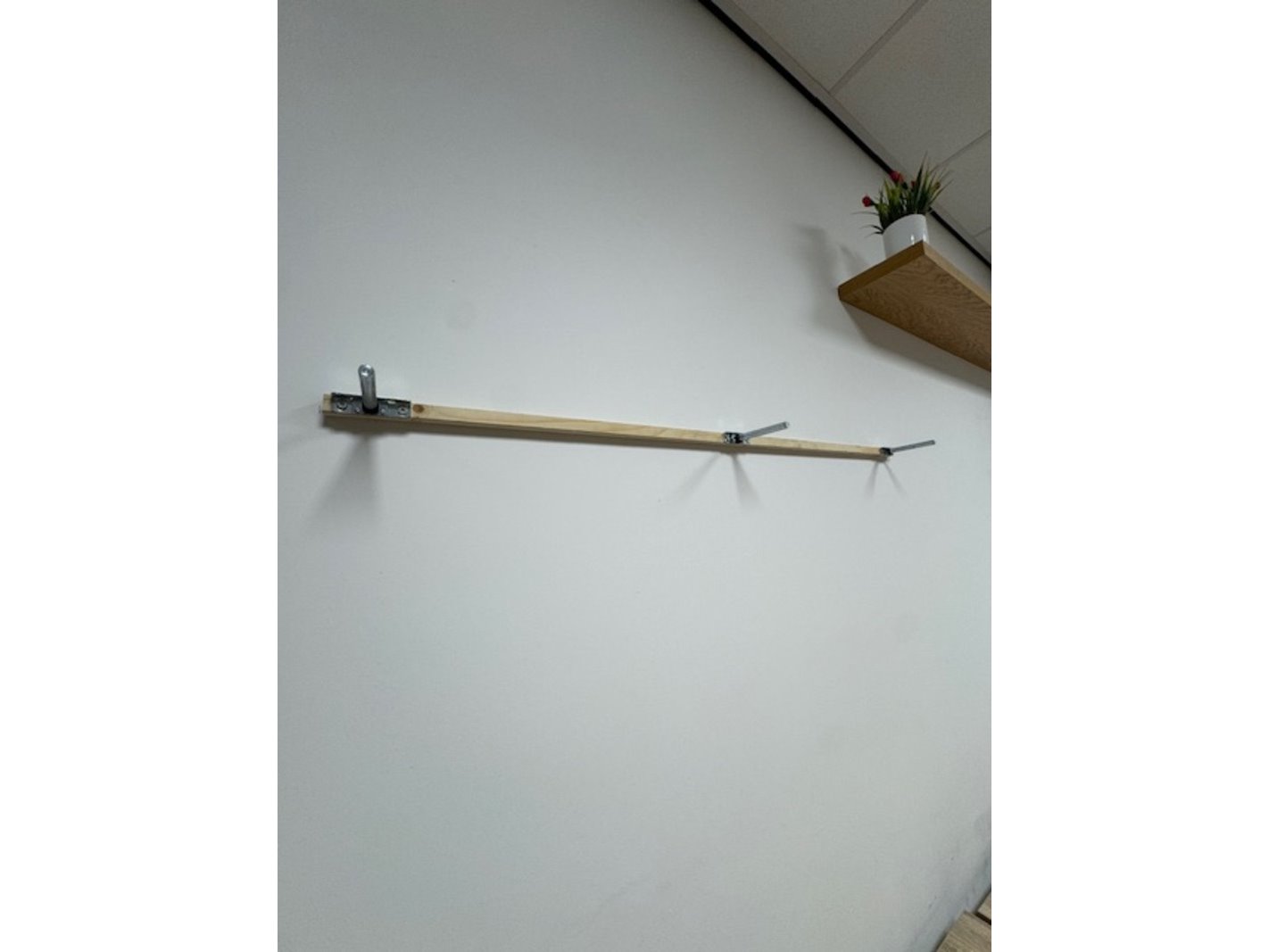 Product: Wandplank Afmeting: lengte ca. 130 cm Specificaties: Bevestigd aan muur, de koper dient zelf te zorgen voor demontage, hoogste plank hangt op ca. 233 cm hoogte