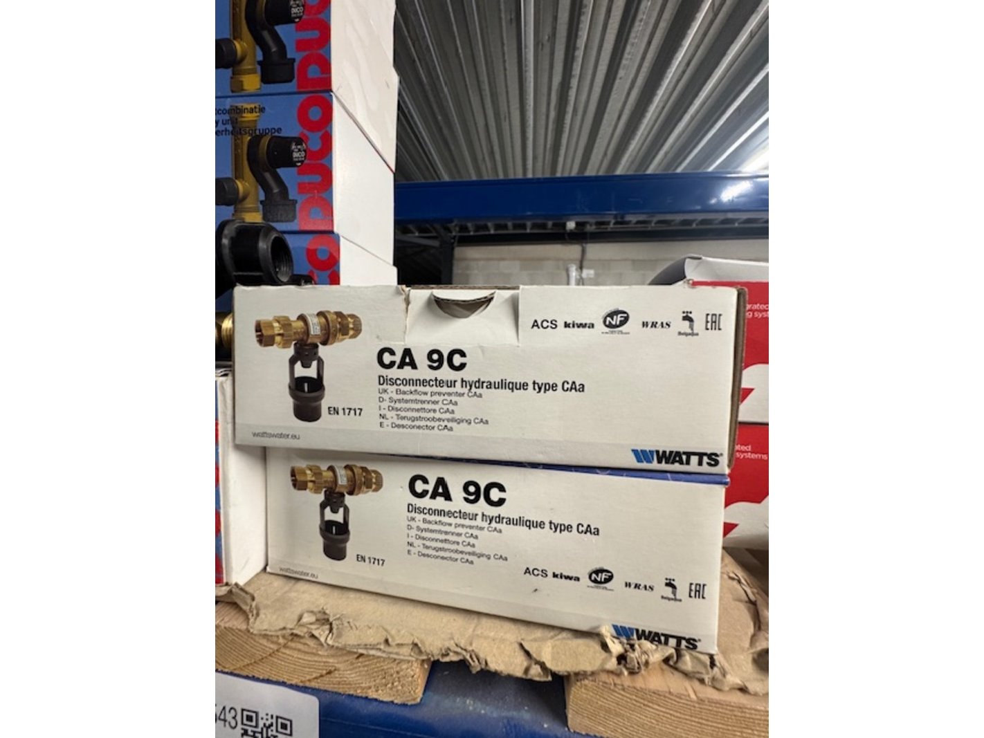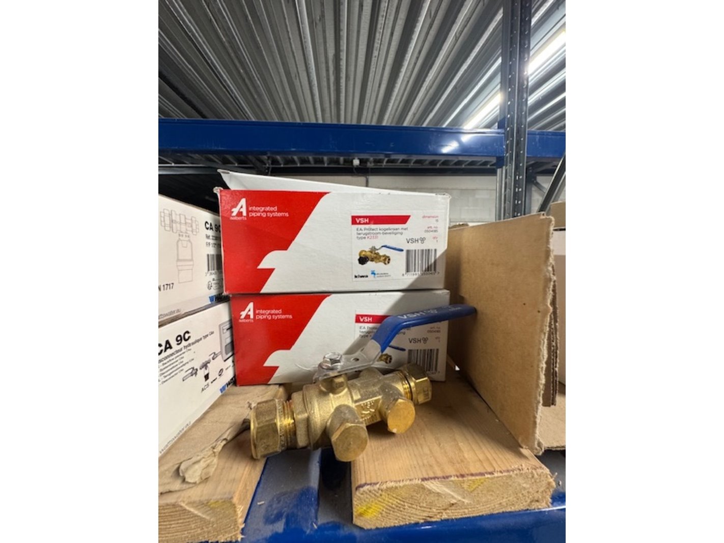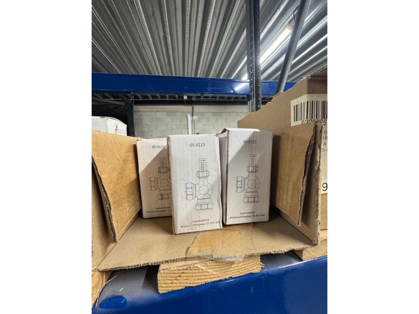 Product: Installatiemateriaal Specificaties: o.a.: ca. 13x boiler inlaatcombinatie; 2x watts CA 9C terugstroombeveiliging; 17x drukverschilregelaar 05-0113; 2x VSH kogelkraan met terugstroombeveiliging; 15x thermometer rood en blauw, 5x watts manometer