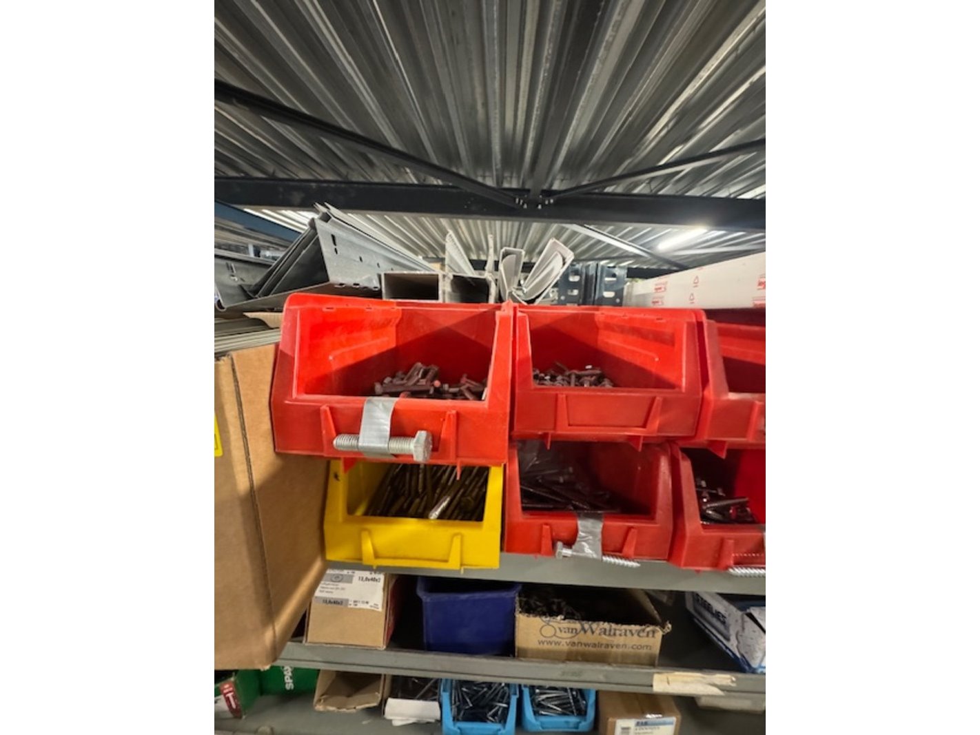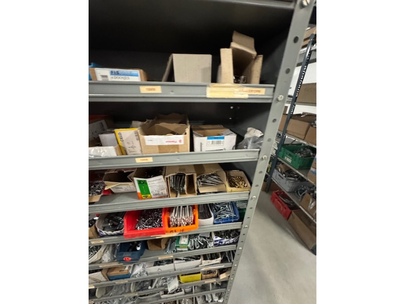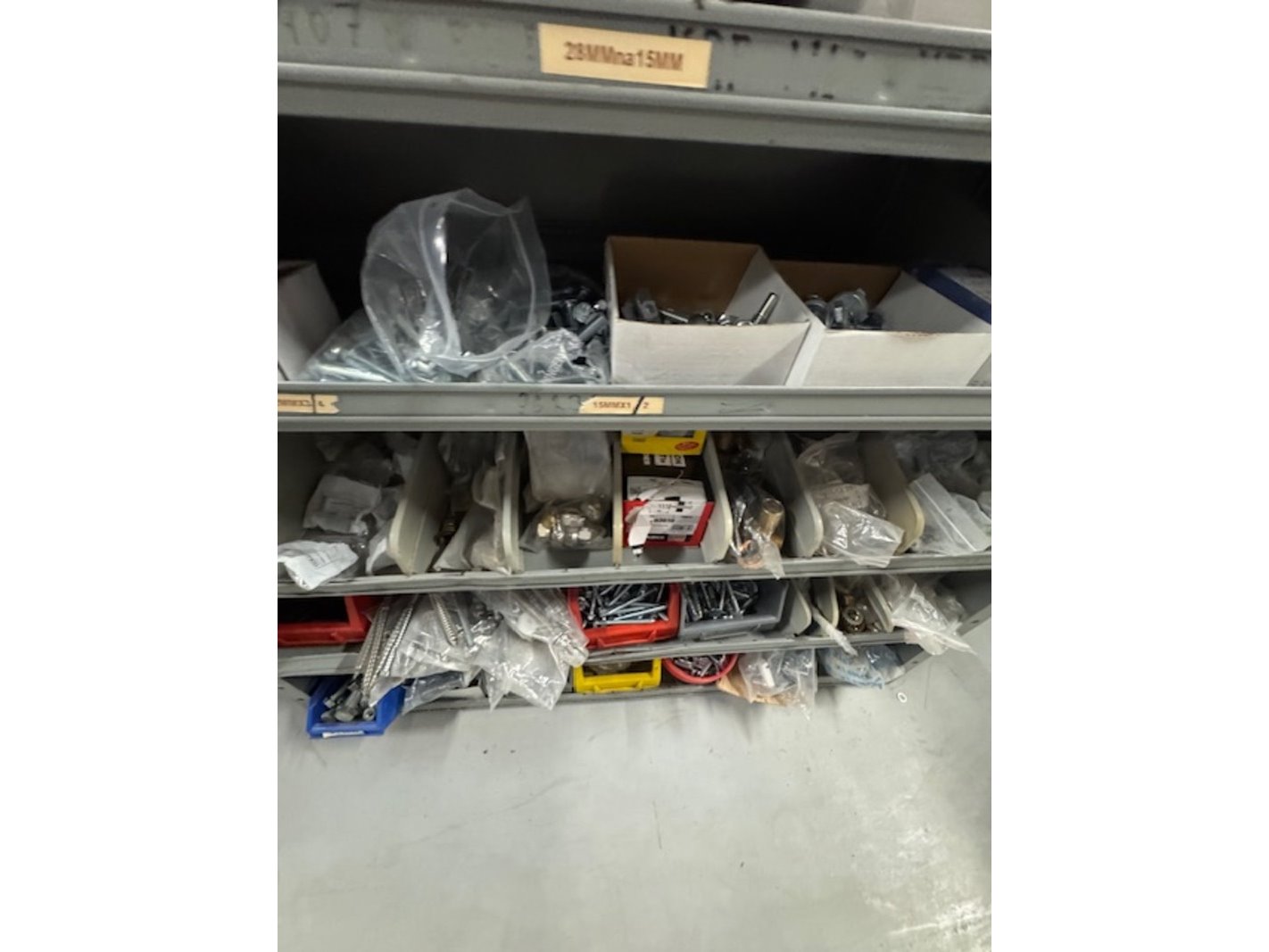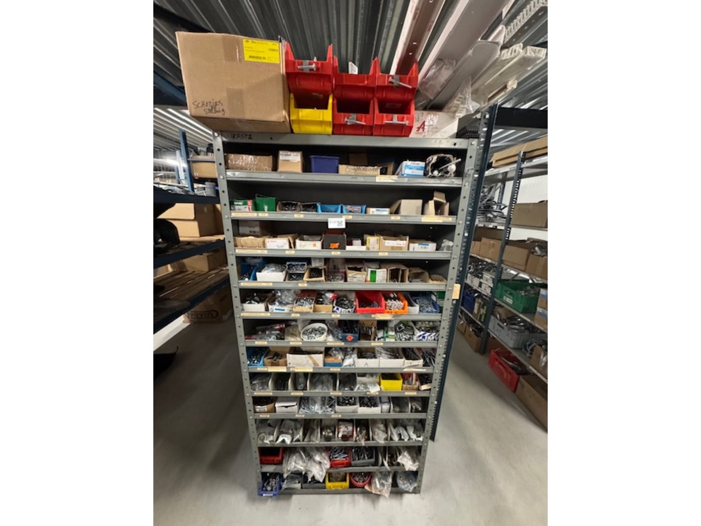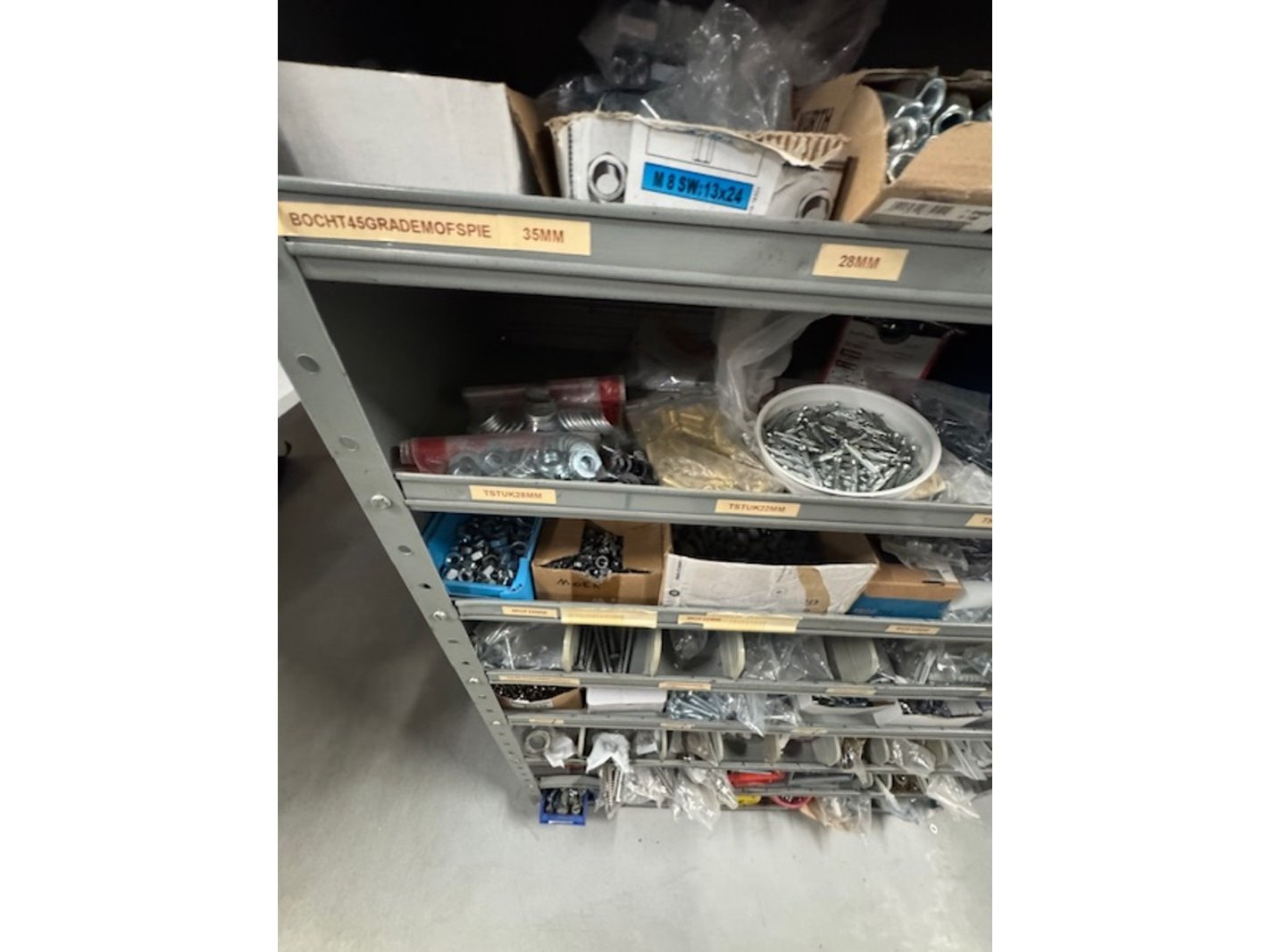Product: Voorraadkast met ijzerwaren Afmeting: bxdxh ca. 100x30x199cm Specificaties: bouten, moeren, schroeven etc.