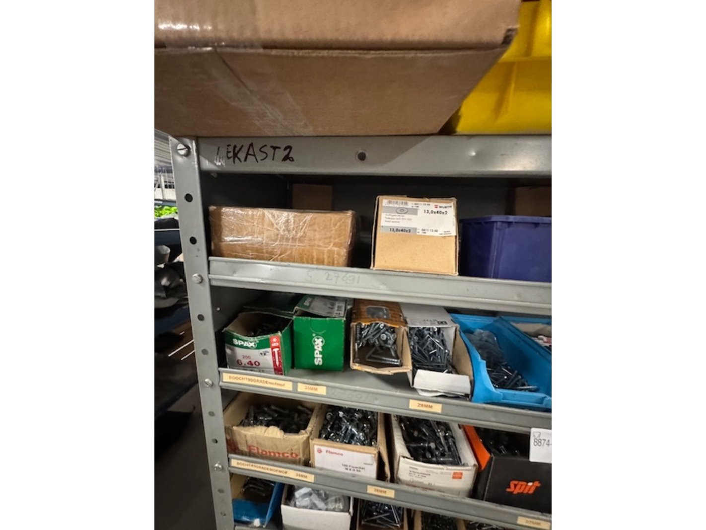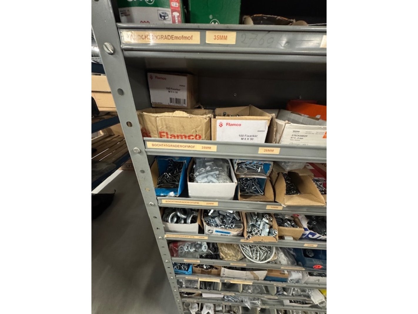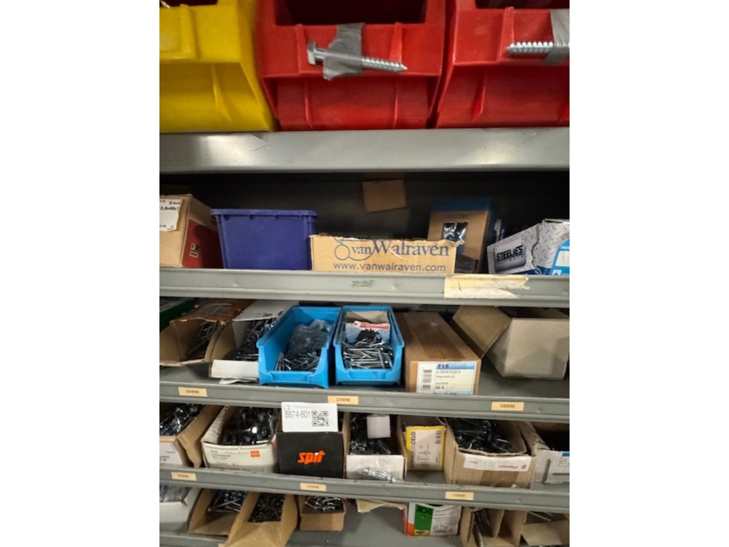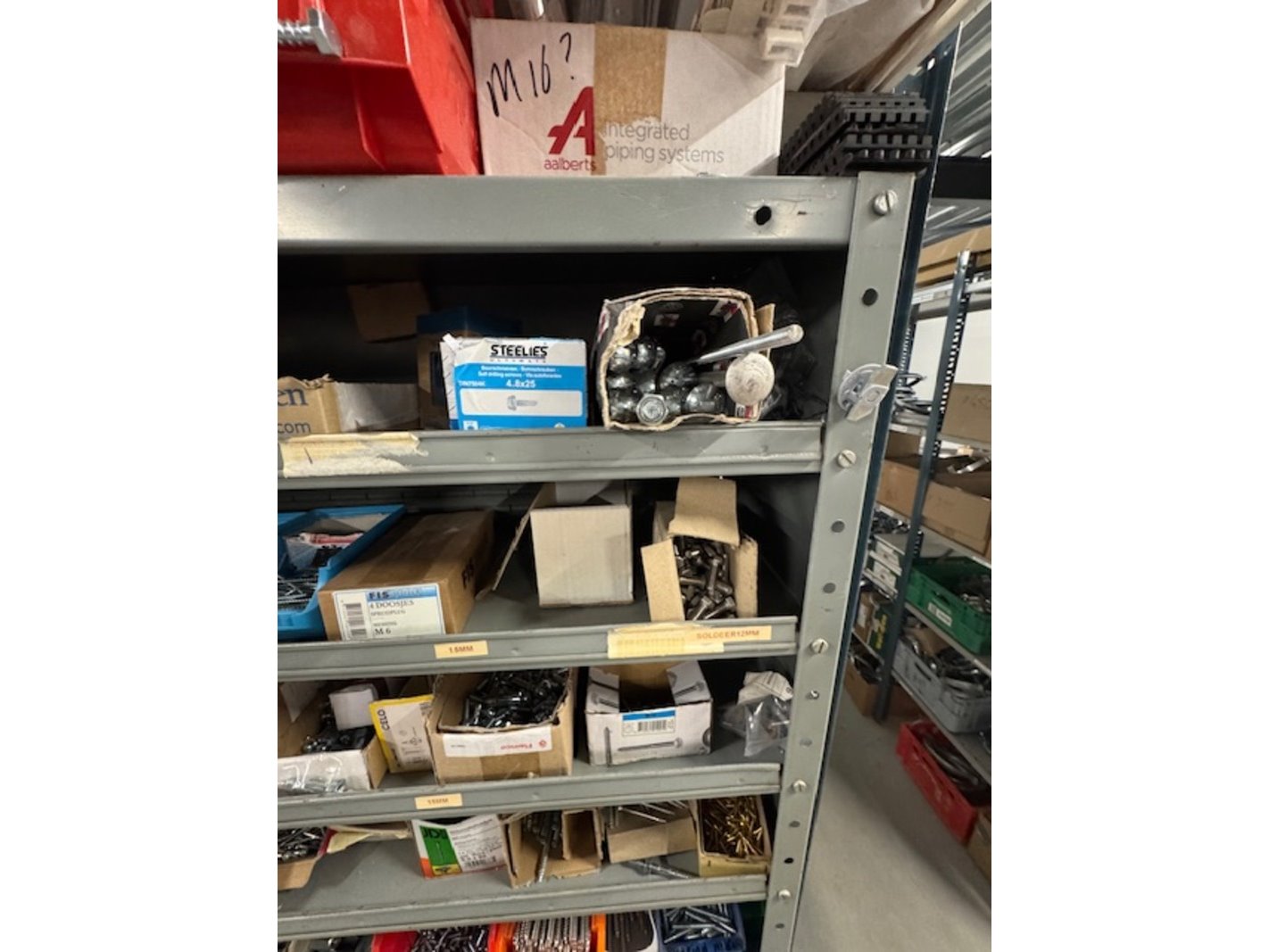 Product: Voorraadkast met ijzerwaren Afmeting: bxdxh ca. 100x30x199cm Specificaties: bouten, moeren, schroeven etc.