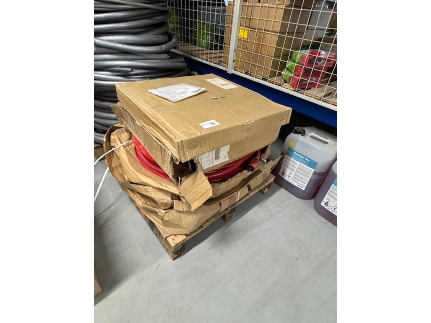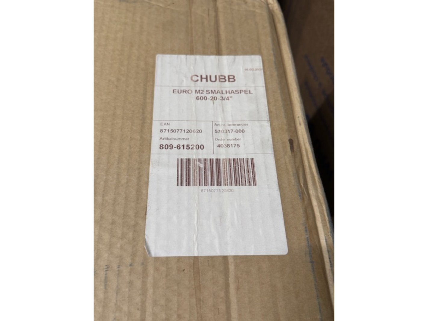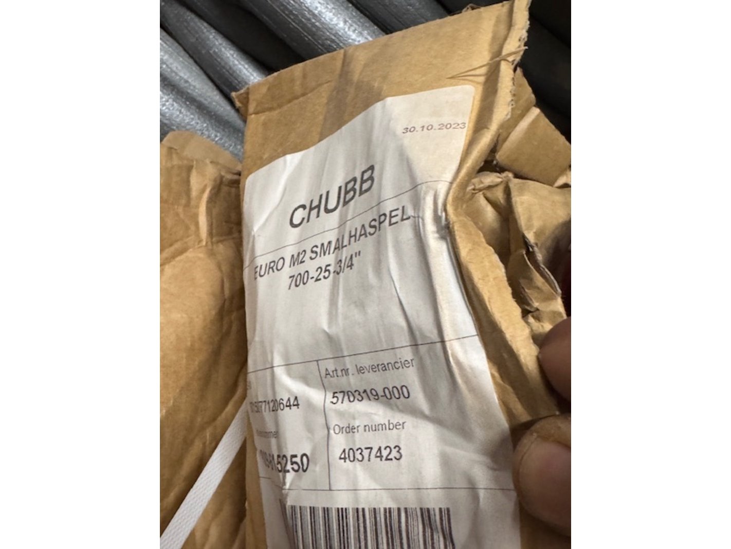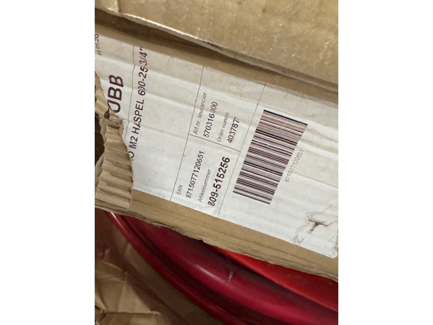 Product: Brandslanghaspel Kleur: rood Specificaties: 2x Chubb (smal)haspel M2 600-25-33/4", 2x Chubb 700-25-3/4". 1x Ajax gebruikte haspel diameter 700