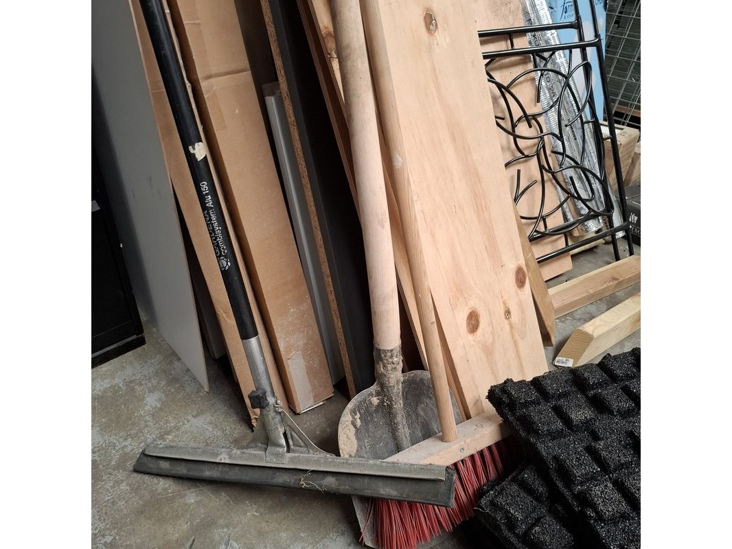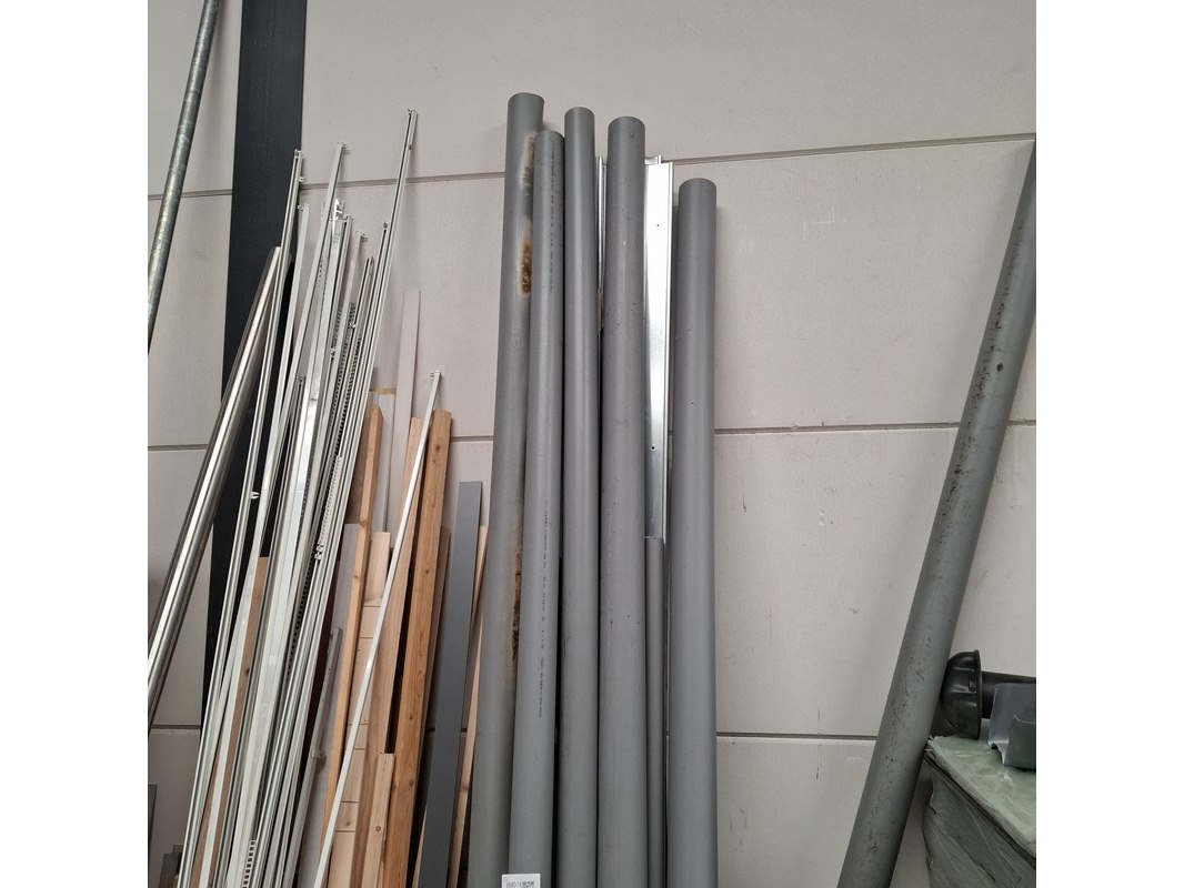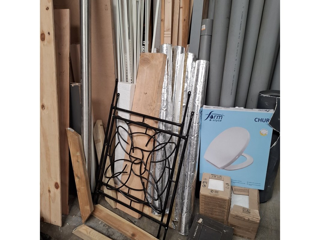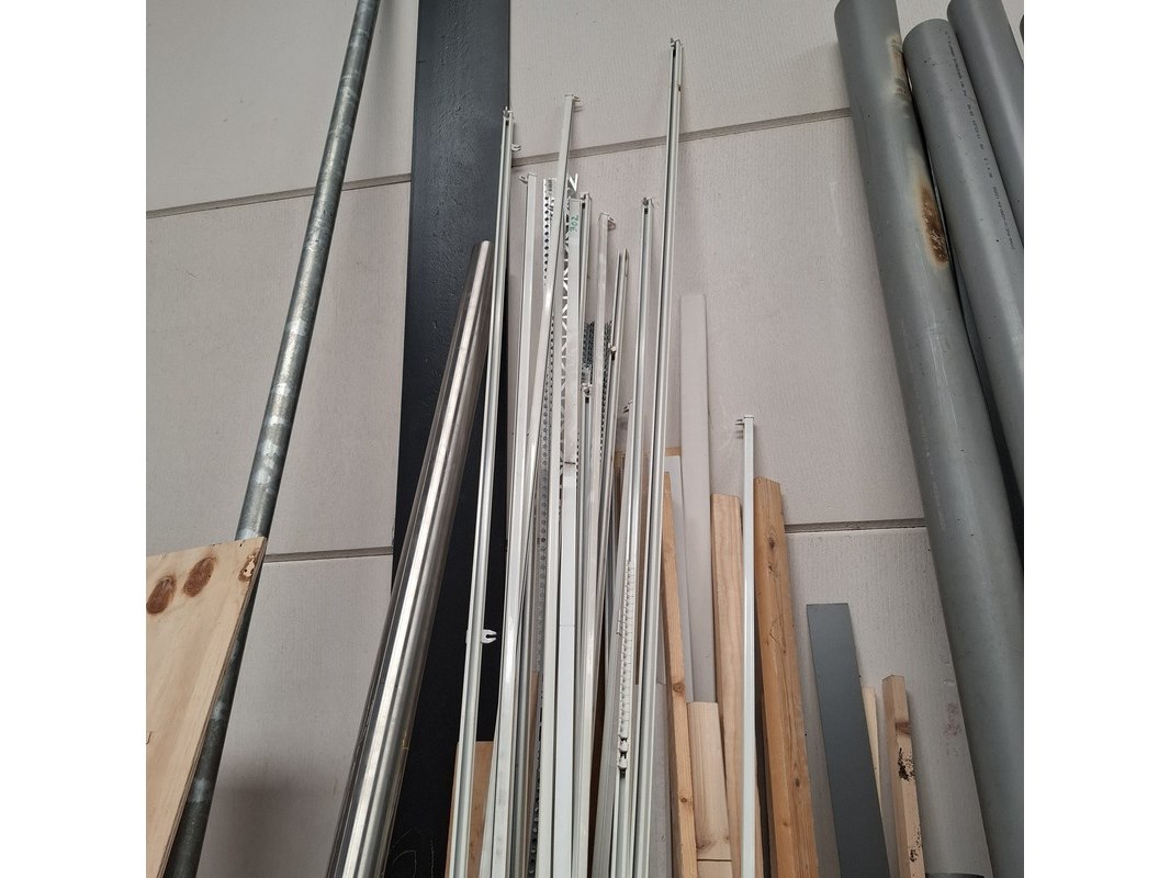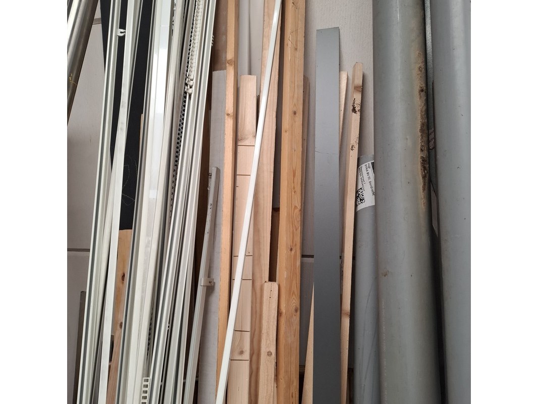 Product: Assortiment bouwbenodigdheden Specificaties: o.a. : diverse pvc buismateriaal, wandtegels, divers houten balkjes, buisisolatie, gordijnrails etc. Max lengte ca. 360cm
