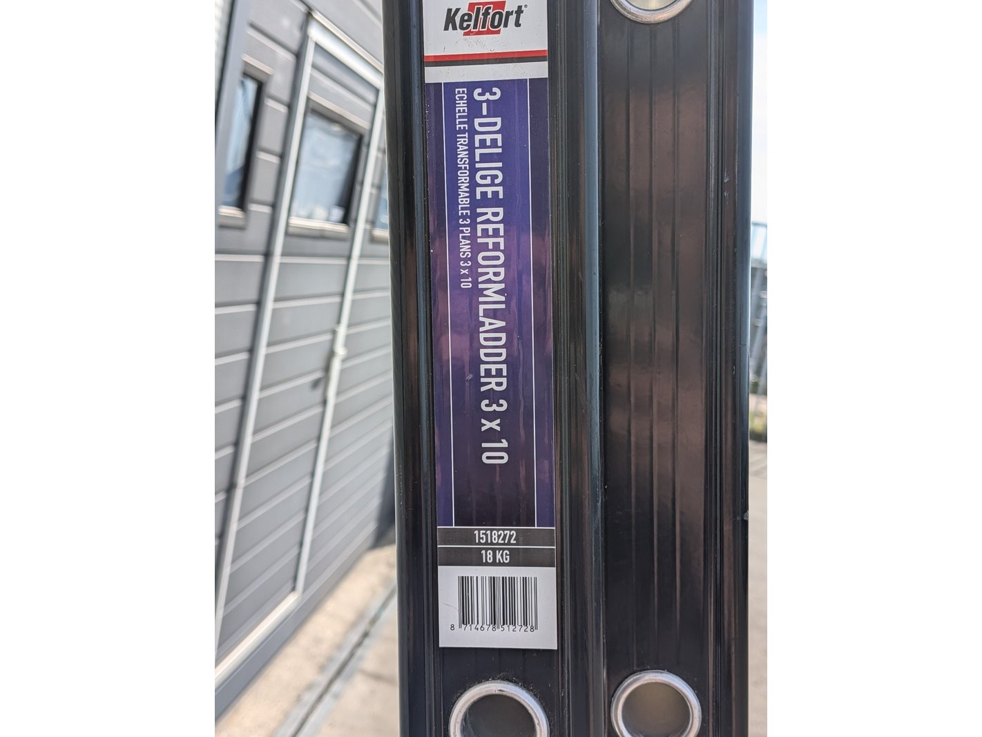 Merk: Kelfort Product: 3-delig reformladder 3x10 Conditie: gebruikt Specificaties: Eigen gewicht 18lg