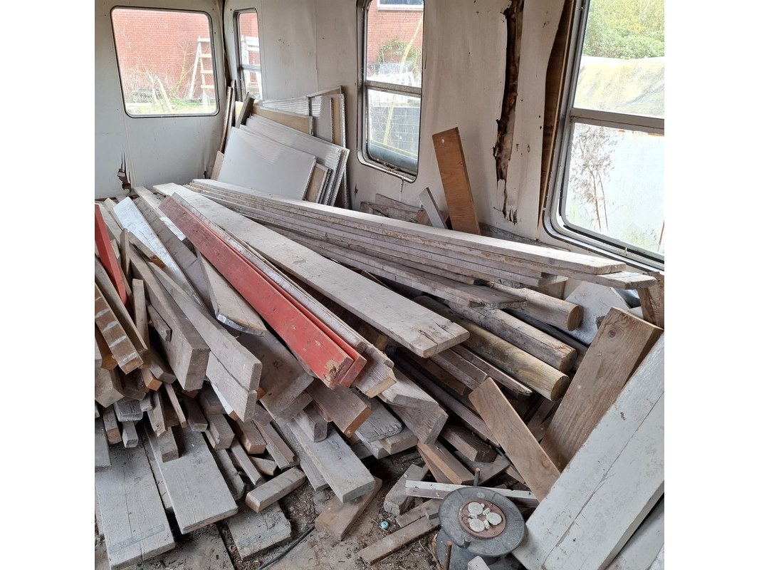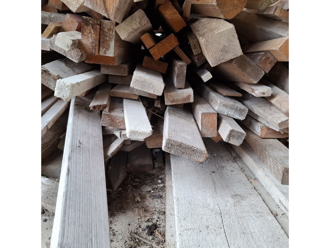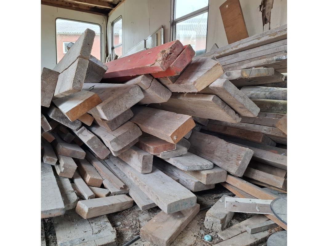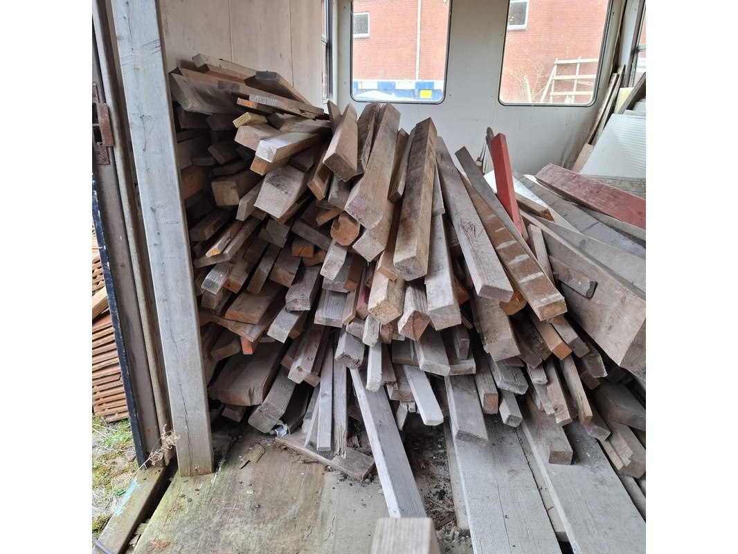 Product: Partij houten planken, balken en steigerplanken Afmeting: max lengte ca. 480cm Specificaties: diverse kopmaten