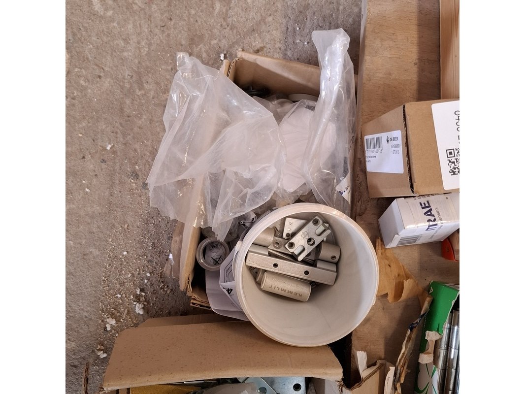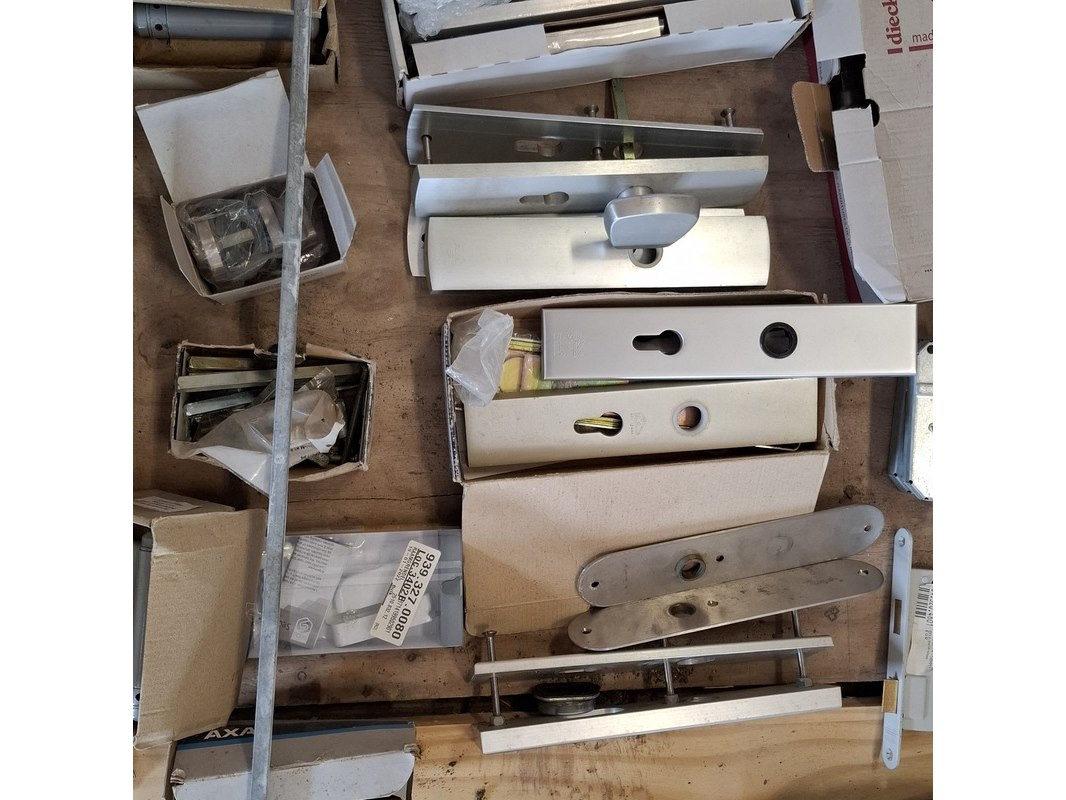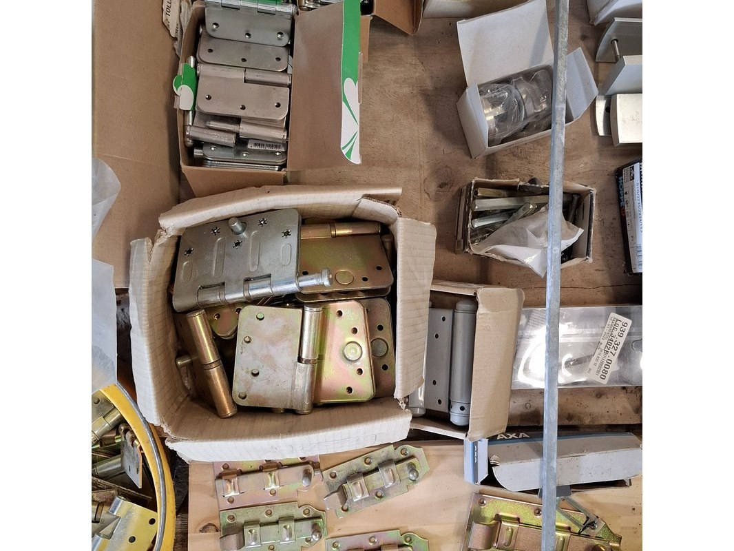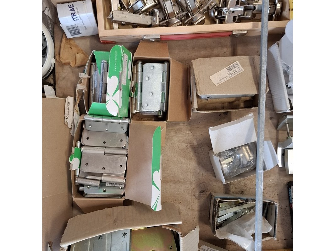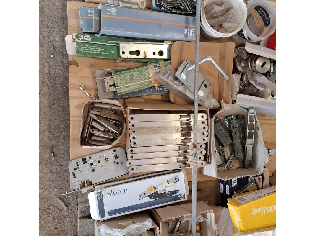 Product: Assortiment hang en sluitwerk Specificaties: bestaande uit o.a. : raambomen, tele uitzetters, schilden, krukken, scharnieren, cilinders, diverse sloten, elektronische raamopeners, veiligheidsbeslag etc.