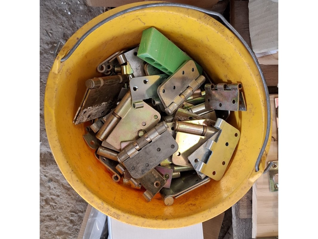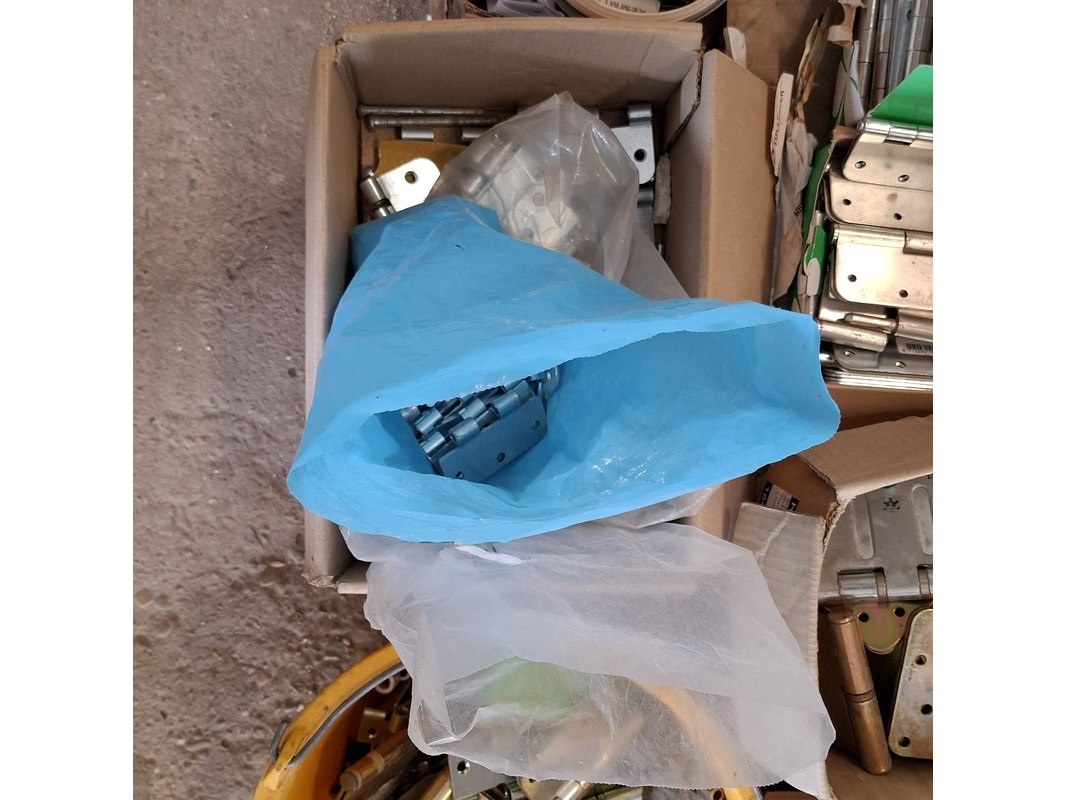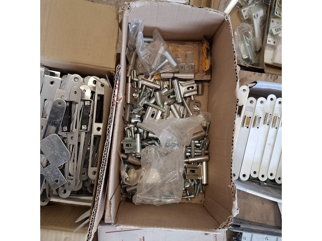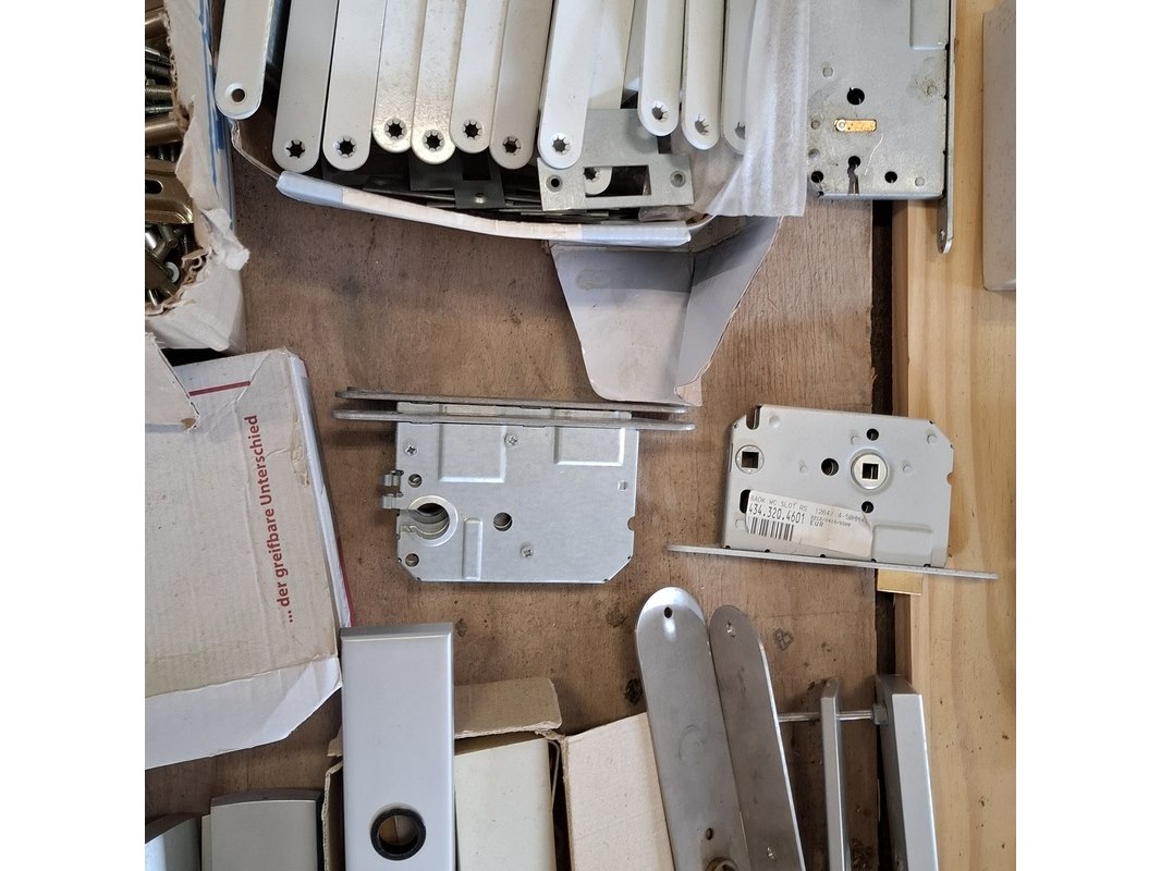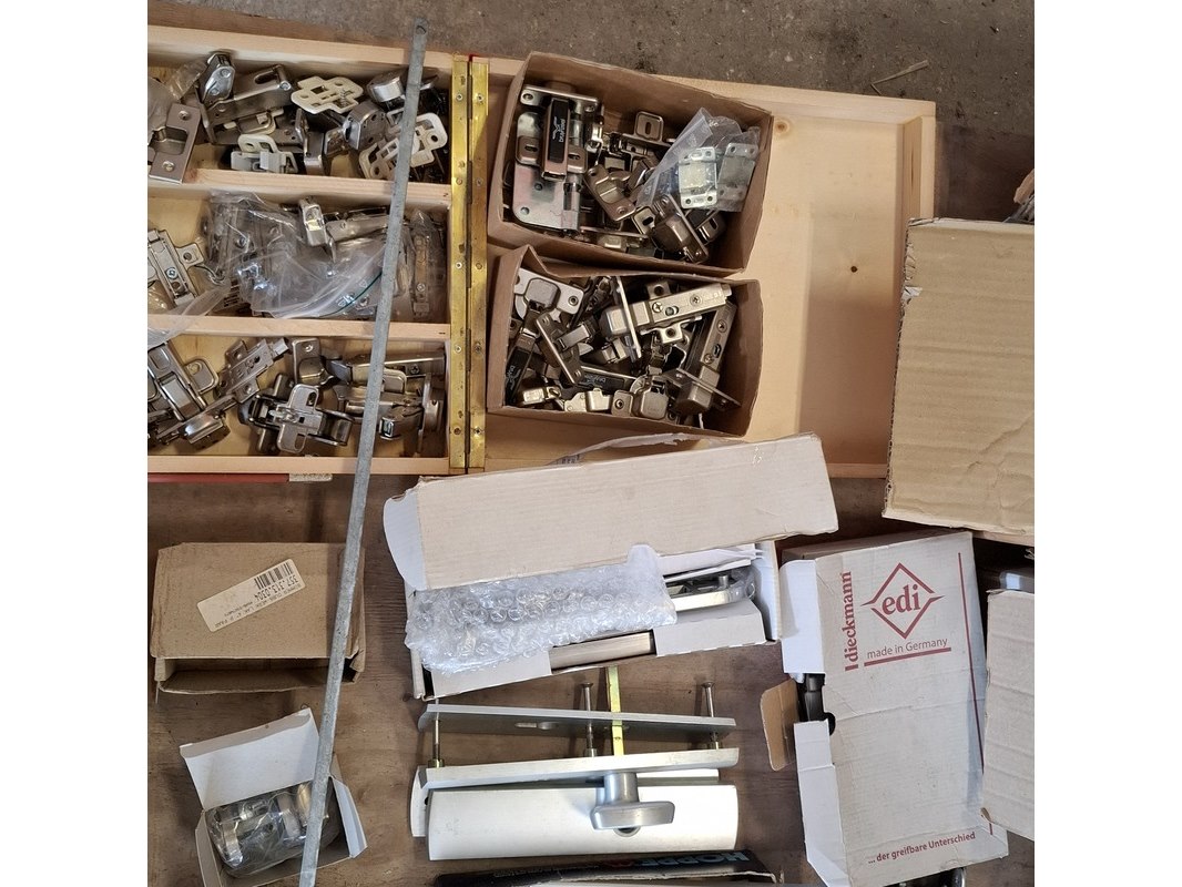 Product: Assortiment hang en sluitwerk Specificaties: bestaande uit o.a. : raambomen, tele uitzetters, schilden, krukken, scharnieren, cilinders, diverse sloten, elektronische raamopeners, veiligheidsbeslag etc.