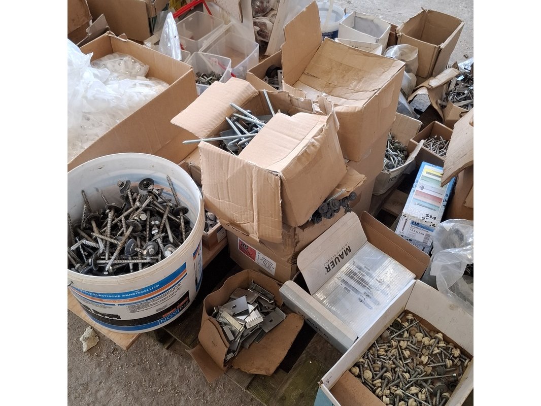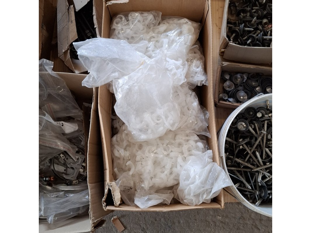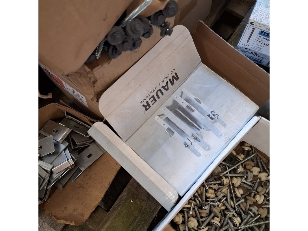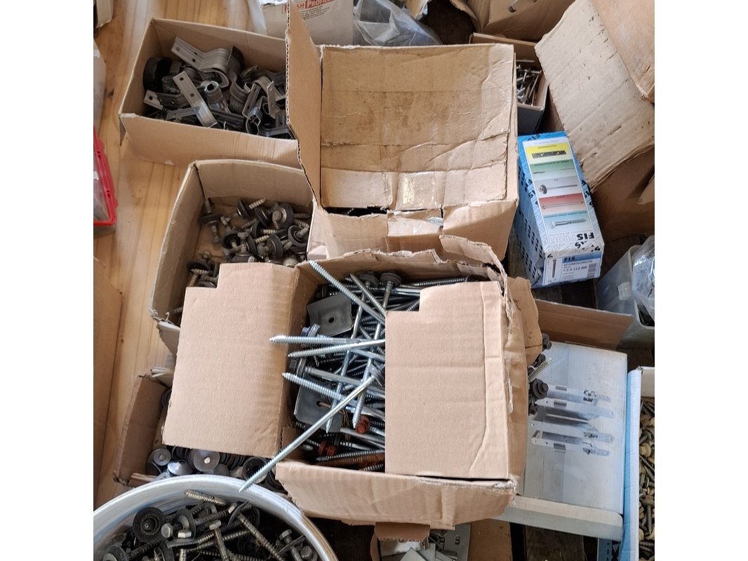 Product: Assortiment ijzerwaar Specificaties: bestaande uit o.a. :panhaken, vloerclips, rvs golfplaatbouten, leidingbeugels, diverse nagels etc.